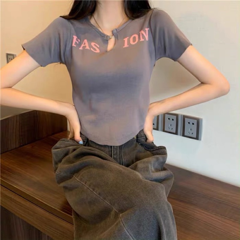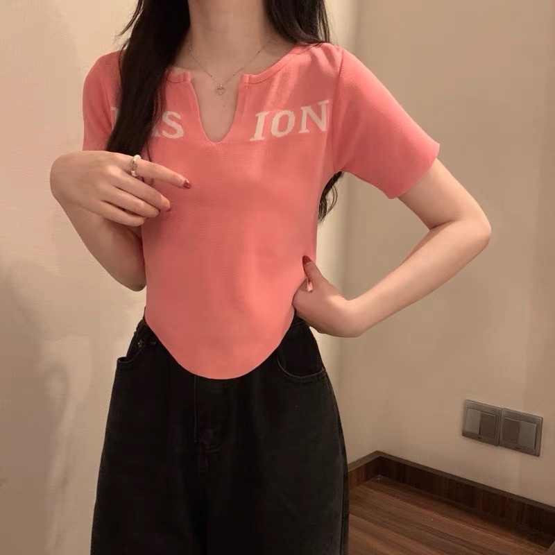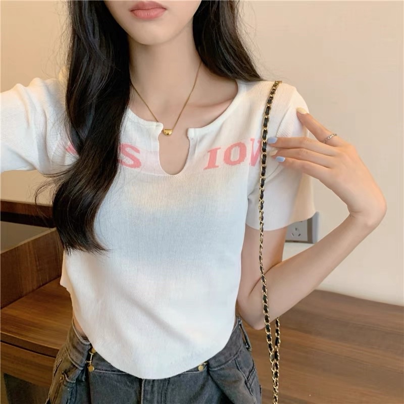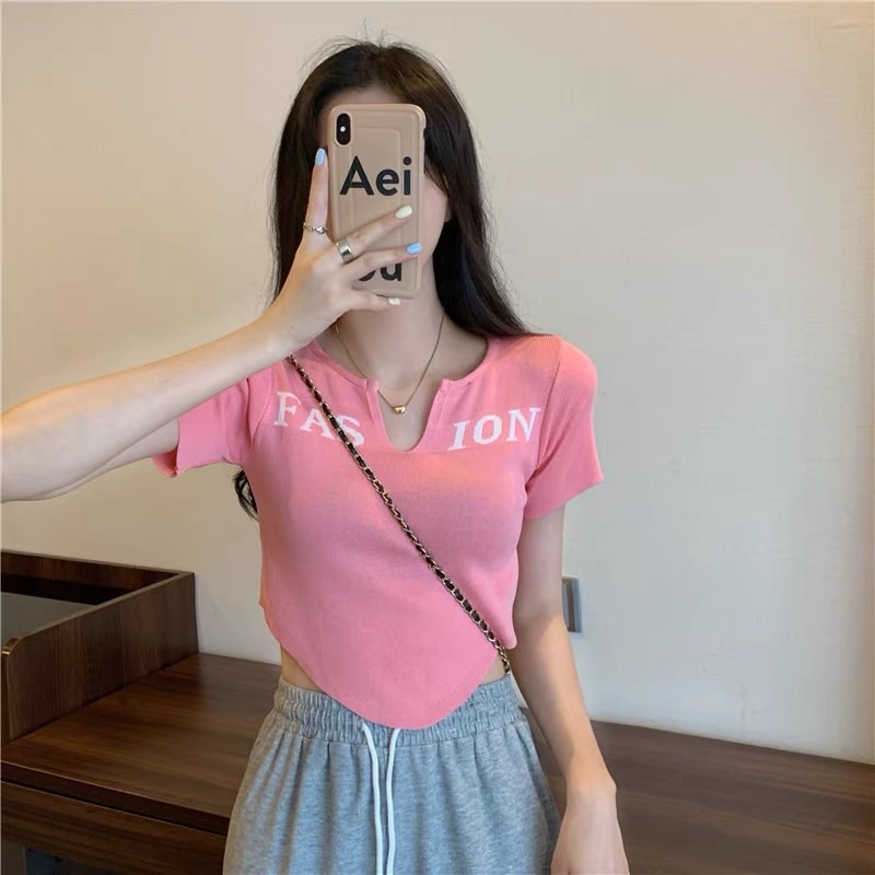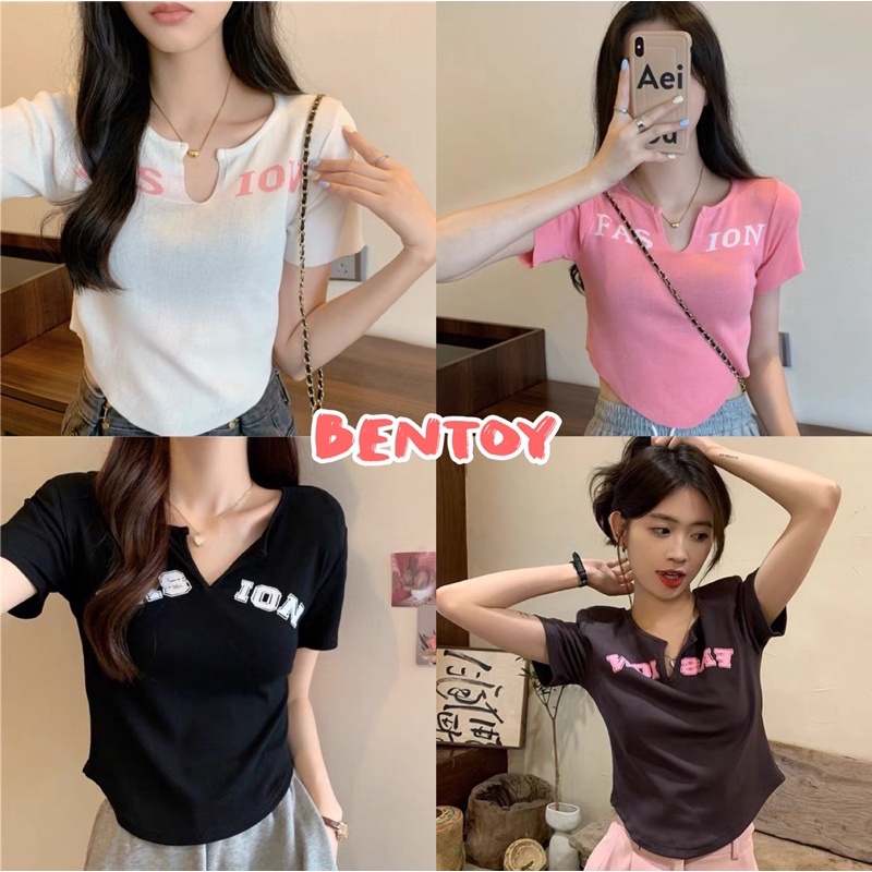 Bentoy(25047)เสื้อครอปอขนสั้นไหมพรม ดีเทลลายอังกฤษ หน้าวี Fashion
