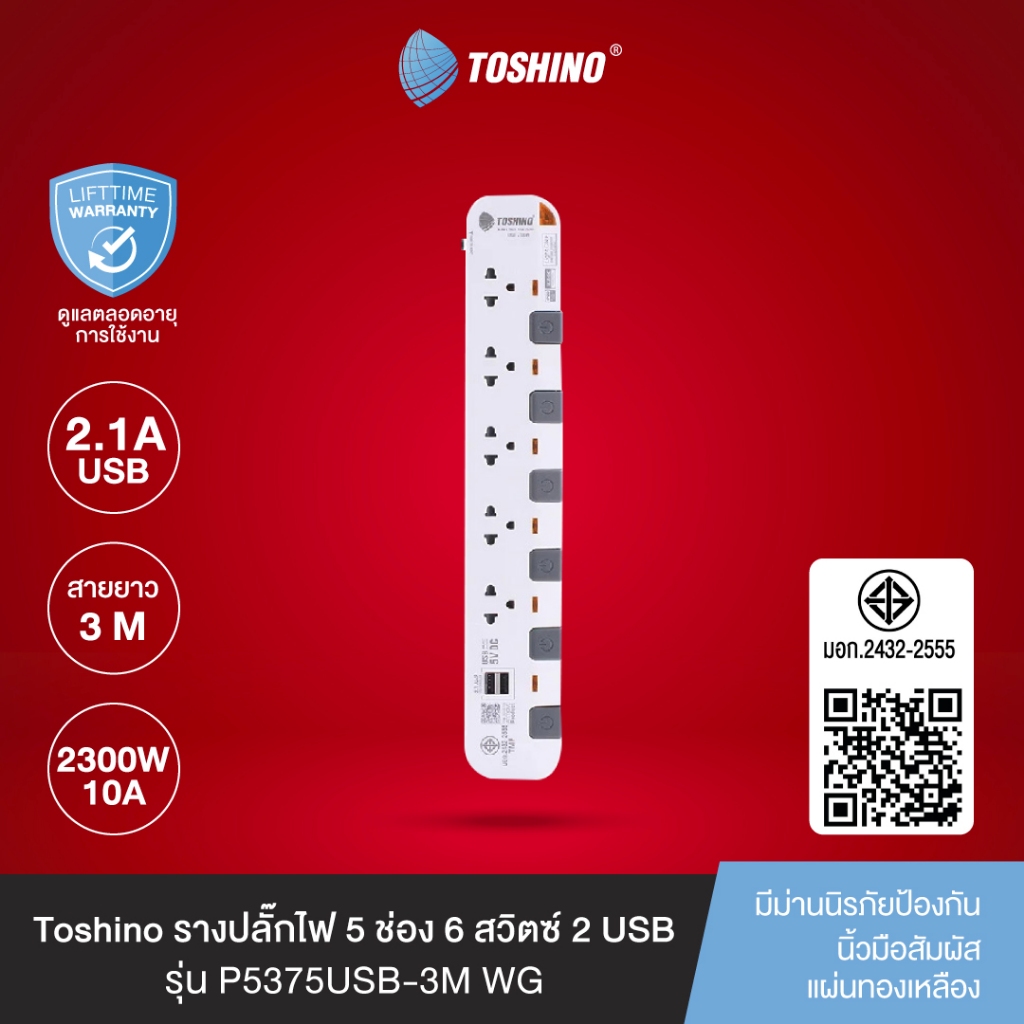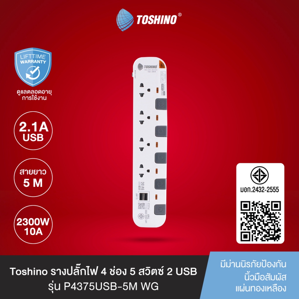 ส่งฟรี Toshino รางปลั๊กไฟ 2 - 5 ช่อง USB 2 ช่อง สายยาว 3 / 5 ม. สีขาว-เทา รุ่น P-USB