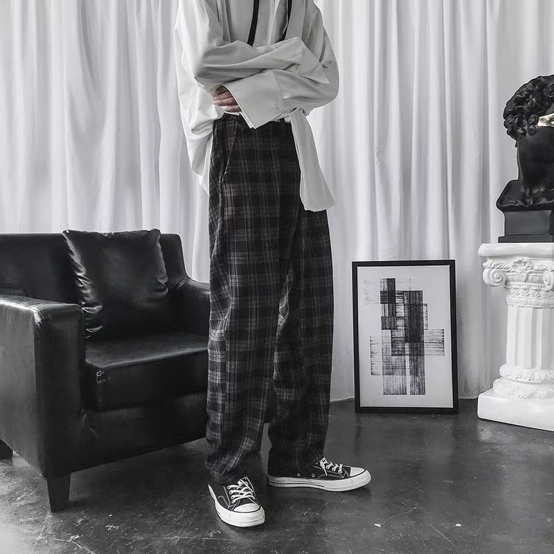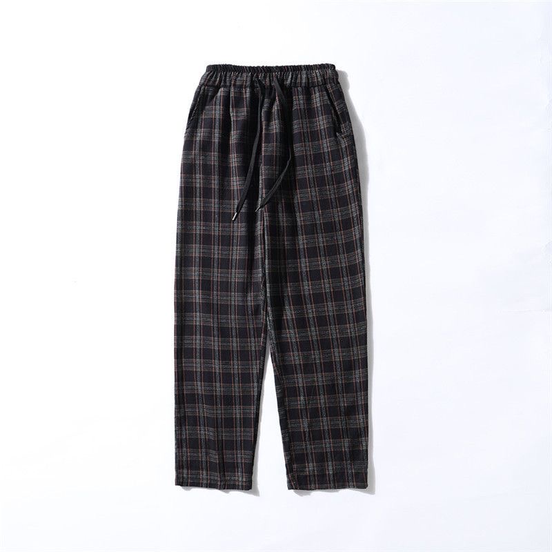 MAXXI[พร้อมส่ง]กางเกงลายสก๊อต ขายาวผู้ชาย ใส่ทำงานผู้ชาย กางเกงเกาหลี สีขาวดำและครีมฟ้ามีเชือกปรับขนาดที่ข้อเท้า