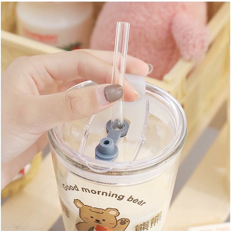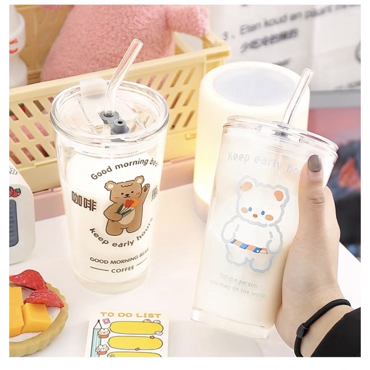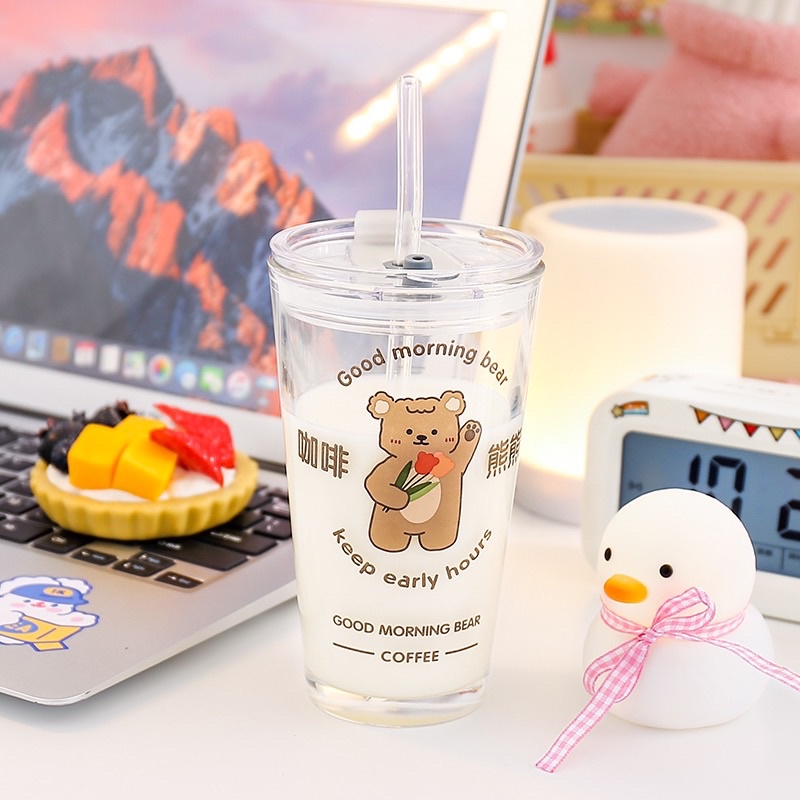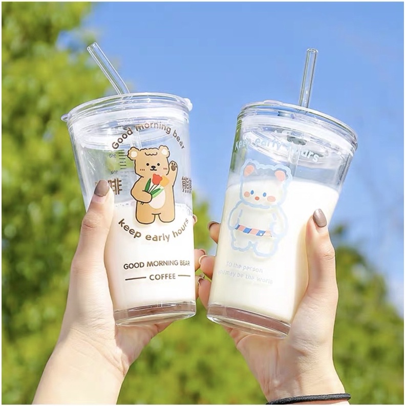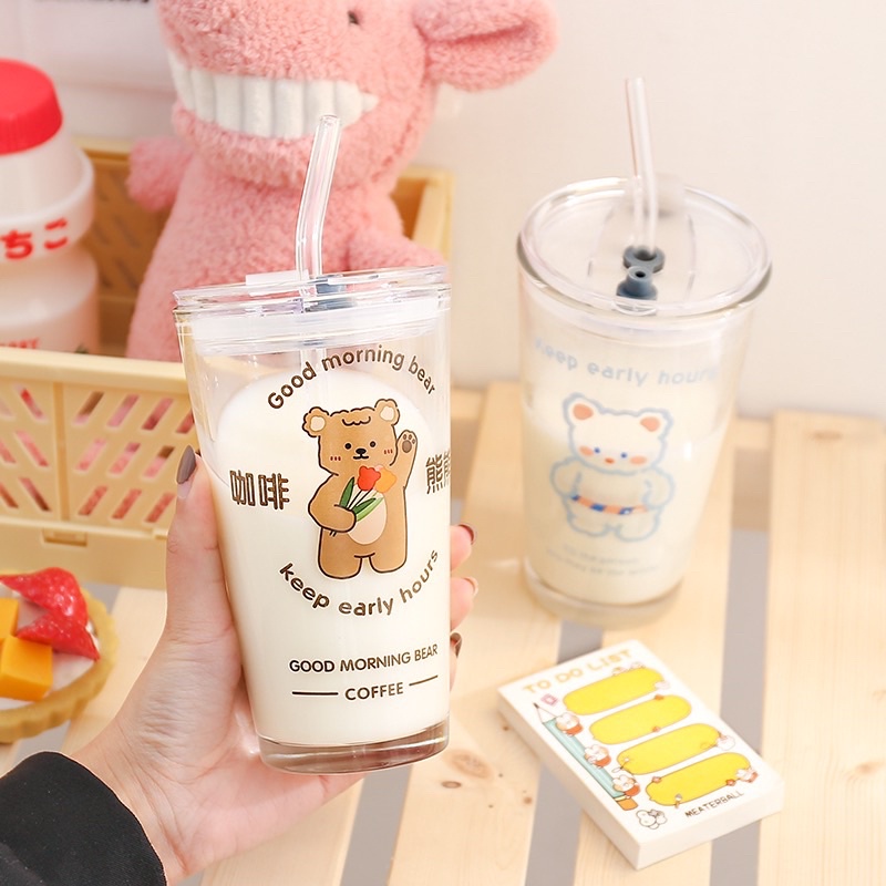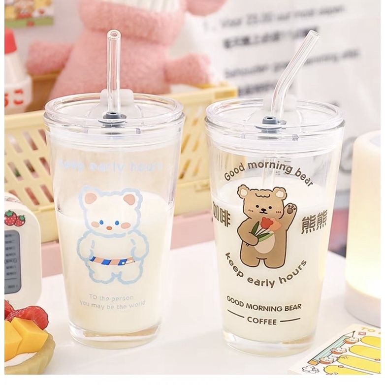 Creative Lifes Shop-แก้ว 💗แก้วน้ำน่ารัก/ถ้วยนมลายหมีน่ารัก 💗 ความจุ 450ml แถมหลอดและฝาปิด!