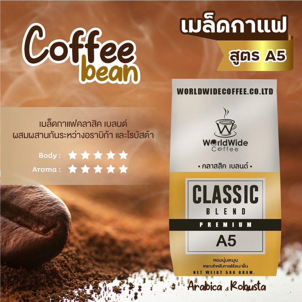 เมล็ดกาแฟคั่วคลาสสิค เบลนด์ A5 หอม เข้มถึงใจ กลมกล่อม รับประกันความอรอ่ย ขนาด 500 g.