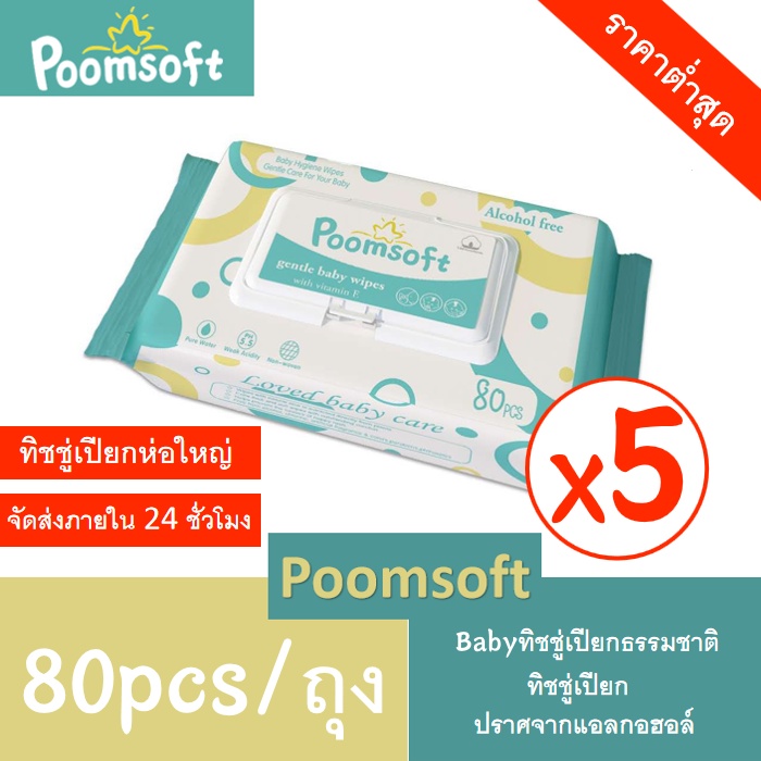 POOMSOFT ทิชชู่เปียก ทิชชูเปียกเด็กแรกเกิด 80แผ่น Baby Wipes x 5 แพ็ค (400 แผ่น) ทิชชู่เปียกเด