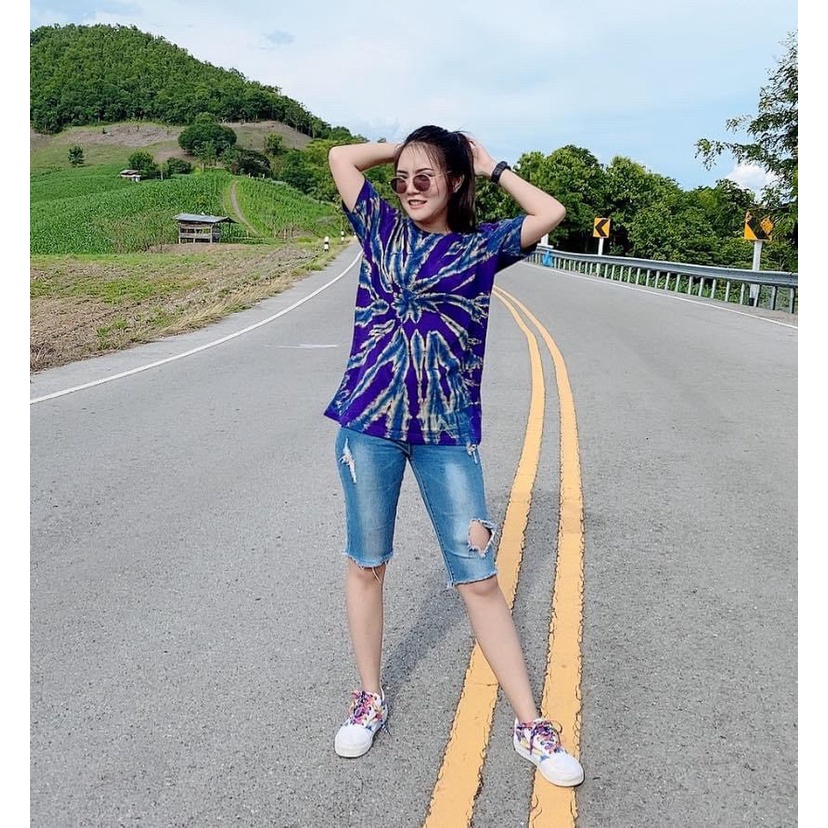 [ลดเพิ่ม 30.- เก็บโค้ดหน้าร้าน] เสื้อยืดมัดย้อม ครามกัดลาย แบบที่ 3
