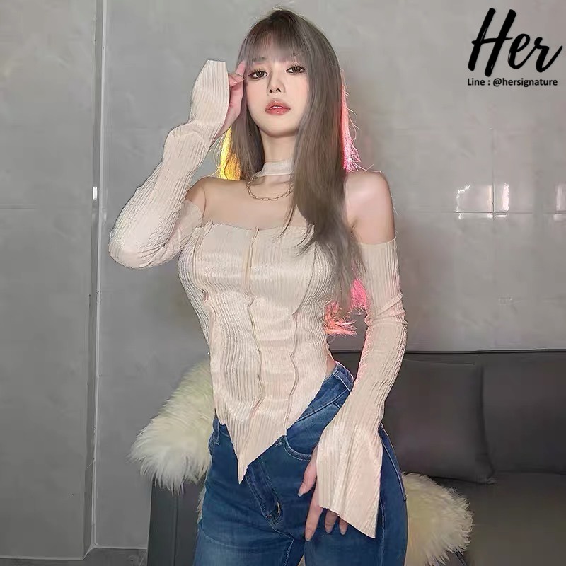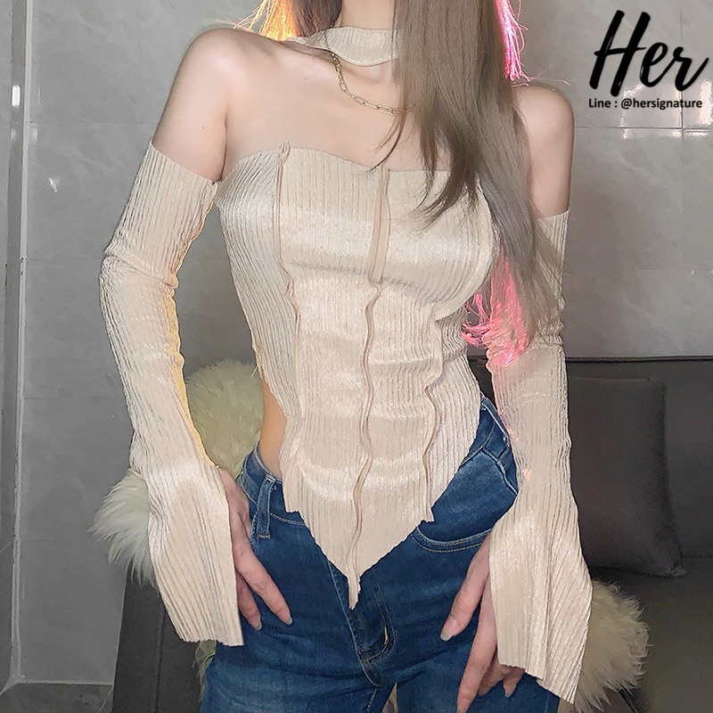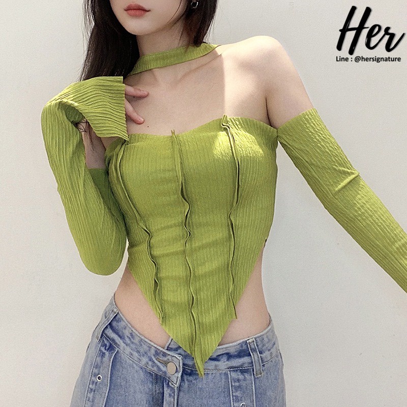 🖤พร้อมส่ง/4สี💚 ครอปแขนยาว ครอปรัดรูป เกาะอกต่อแขน เกาะอกไหมพรม ชุดไปคาเฟ่ ปาดไหล่แขนตุ๊กตา เสื้อไปร้านเหล้า 3631