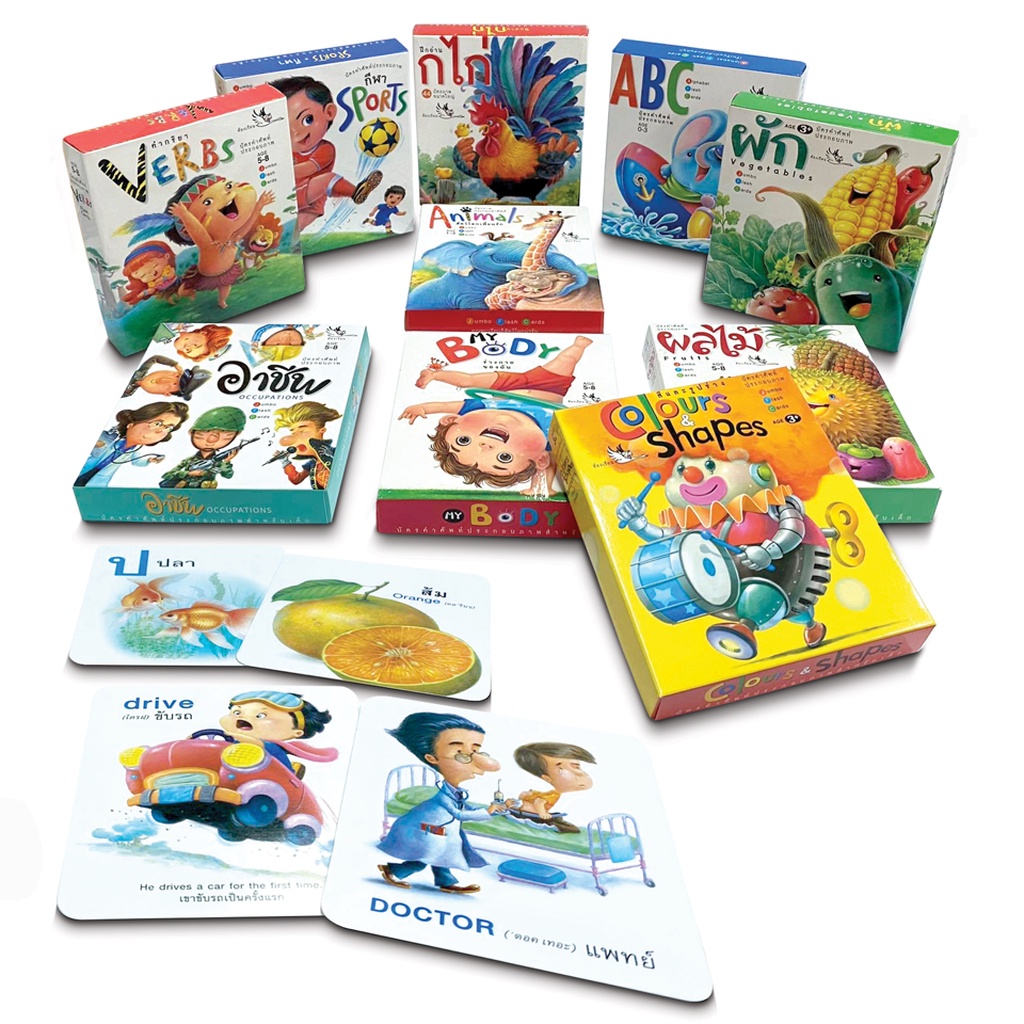 ห้องเรียน บัตรคำศัพท์ 10 กล่อง Flash Card สอน คำศัพท์ภาษาไทย-อังกฤษ บัตรภาพ ก ไก่ ABC สัตว์ ผัก ผลไม้