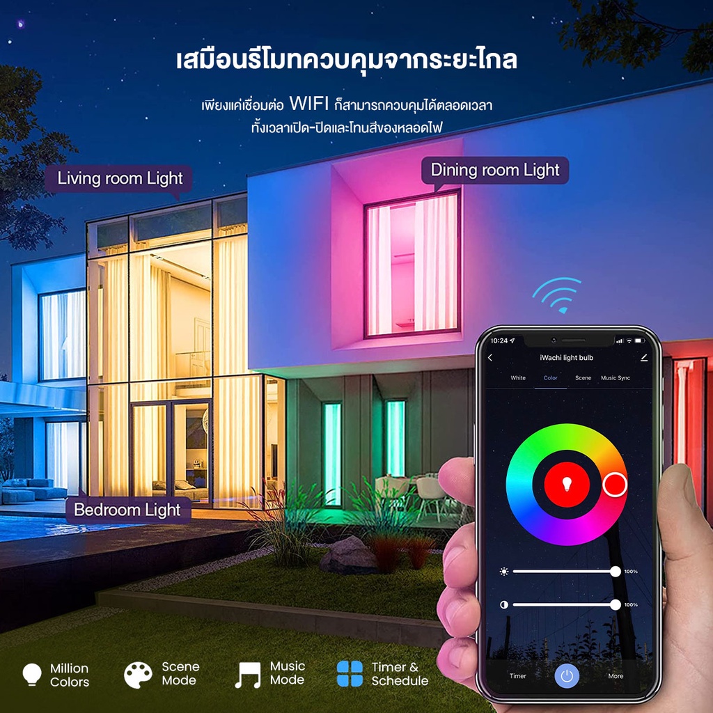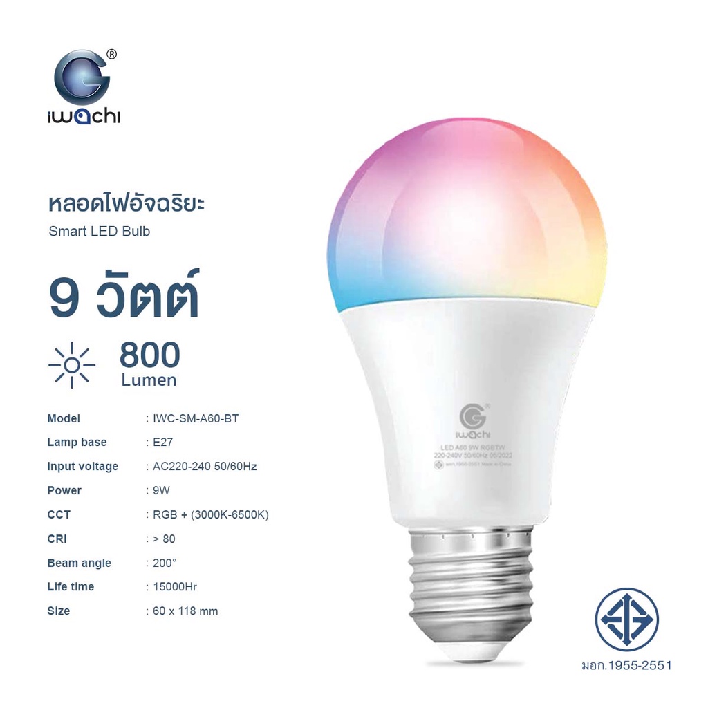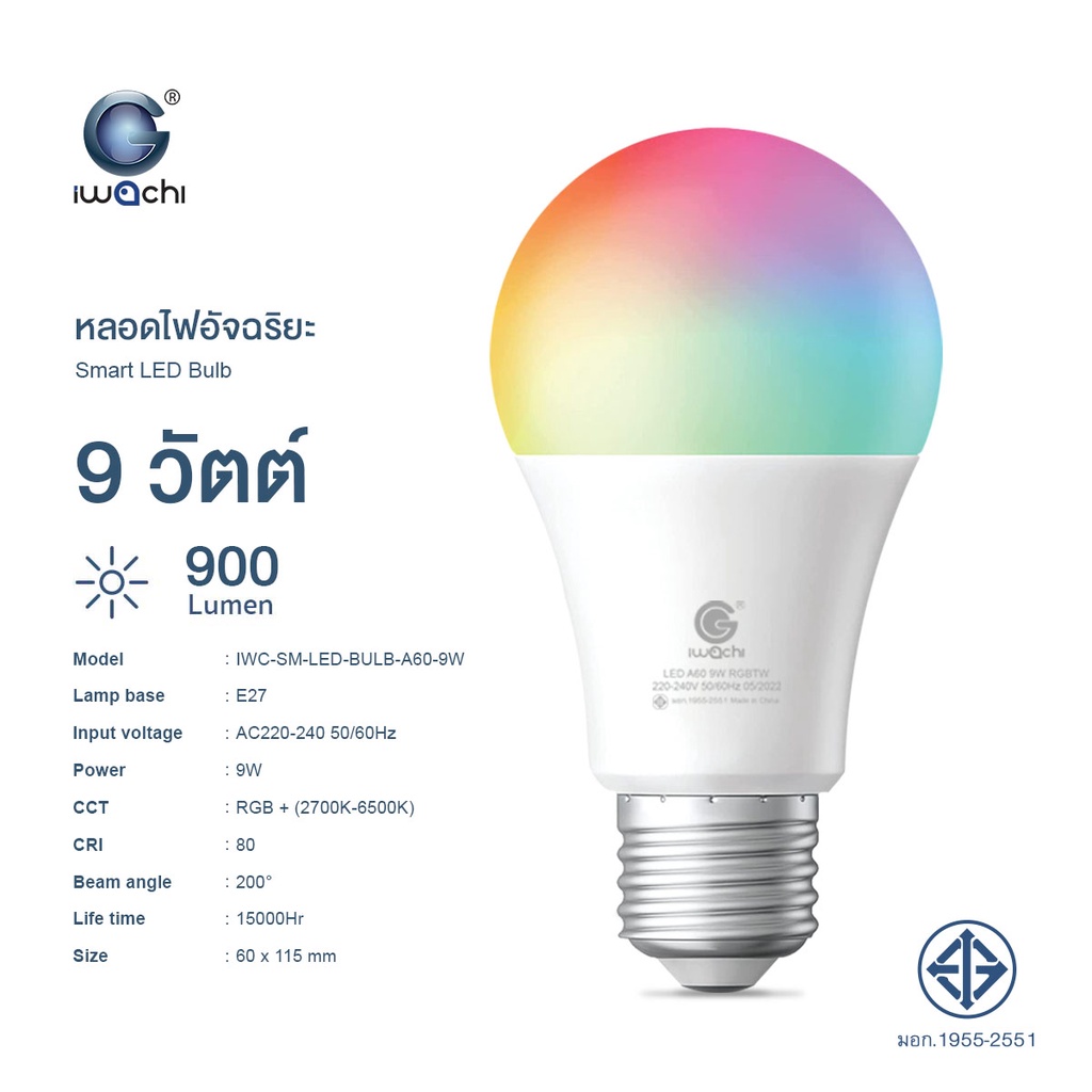 IWACHI หลอดไฟอัจฉริยะ Smart LED Bulb WiFi / Bluetooth RGB+CCT E27 ควบค ุมผ่าน APP มีรีโมท ปรับได้ 16 ล้านสี
