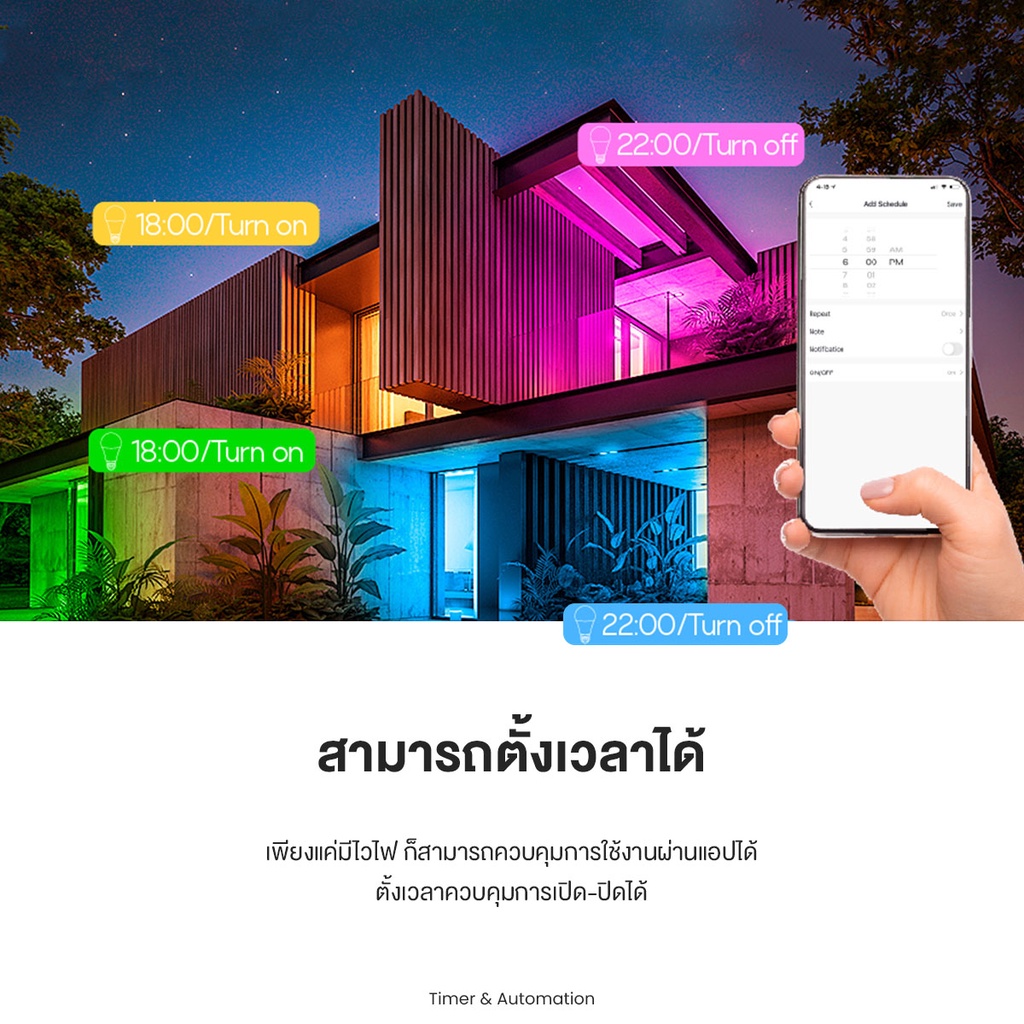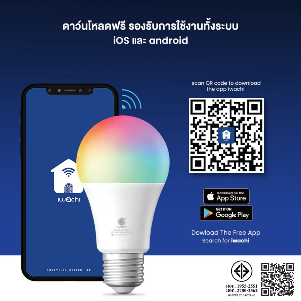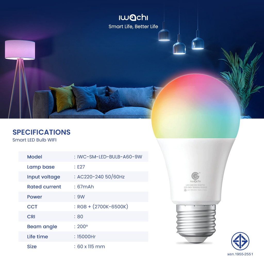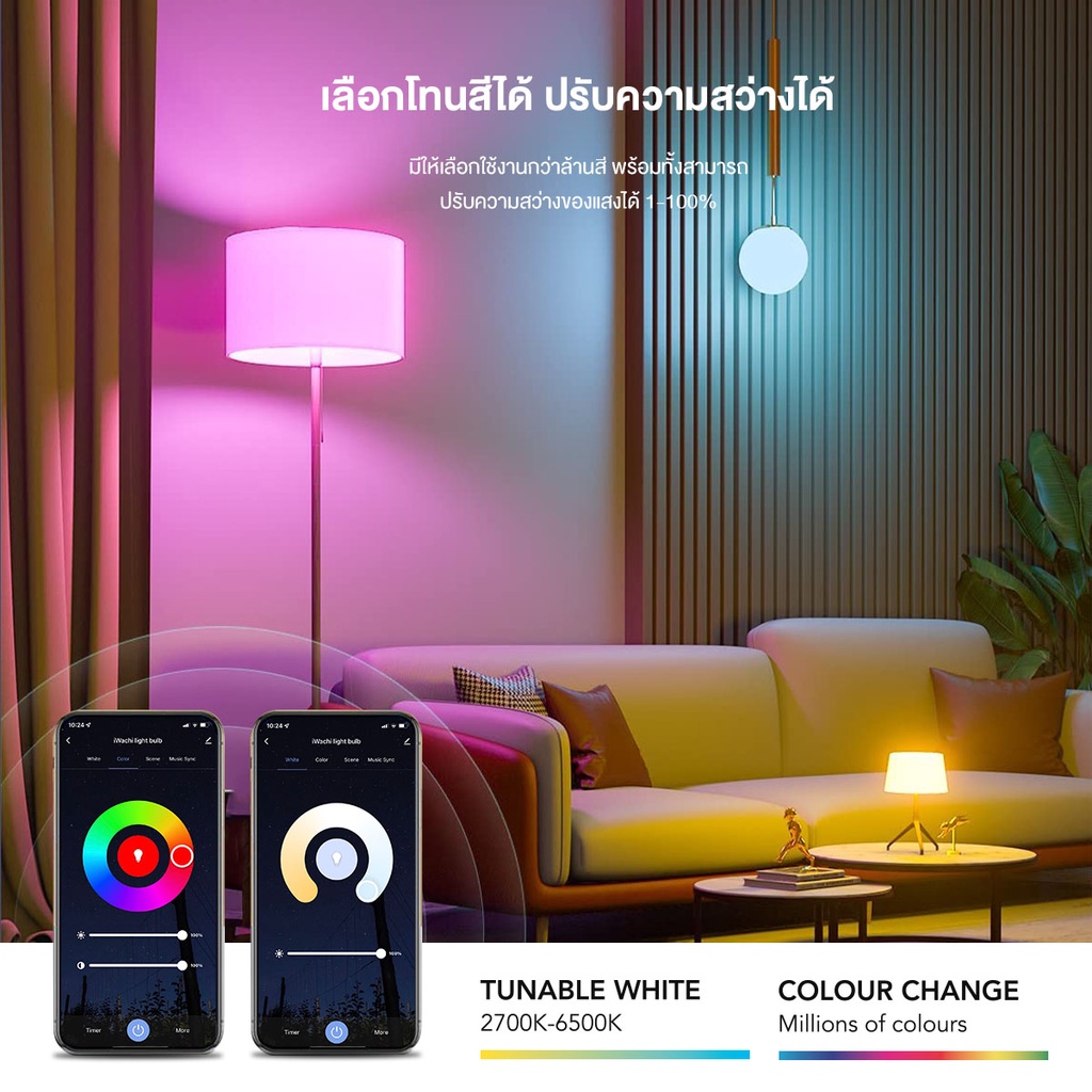 IWACHI หลอดไฟอัจฉริยะ Smart LED Bulb WiFi / Bluetooth RGB+CCT E27 ควบค ุมผ่าน APP มีรีโมท ปรับได้ 16 ล้านสี