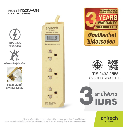 [ส่งไว ประกันศูนย์ไทย] Anitech รุ่น H1233 ปลั๊กไฟมาตรฐาน มอก. 3 ช่อง 1 สวิตช์ สายยาว 3 เมตร