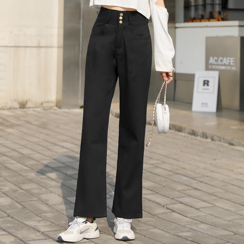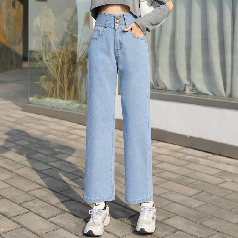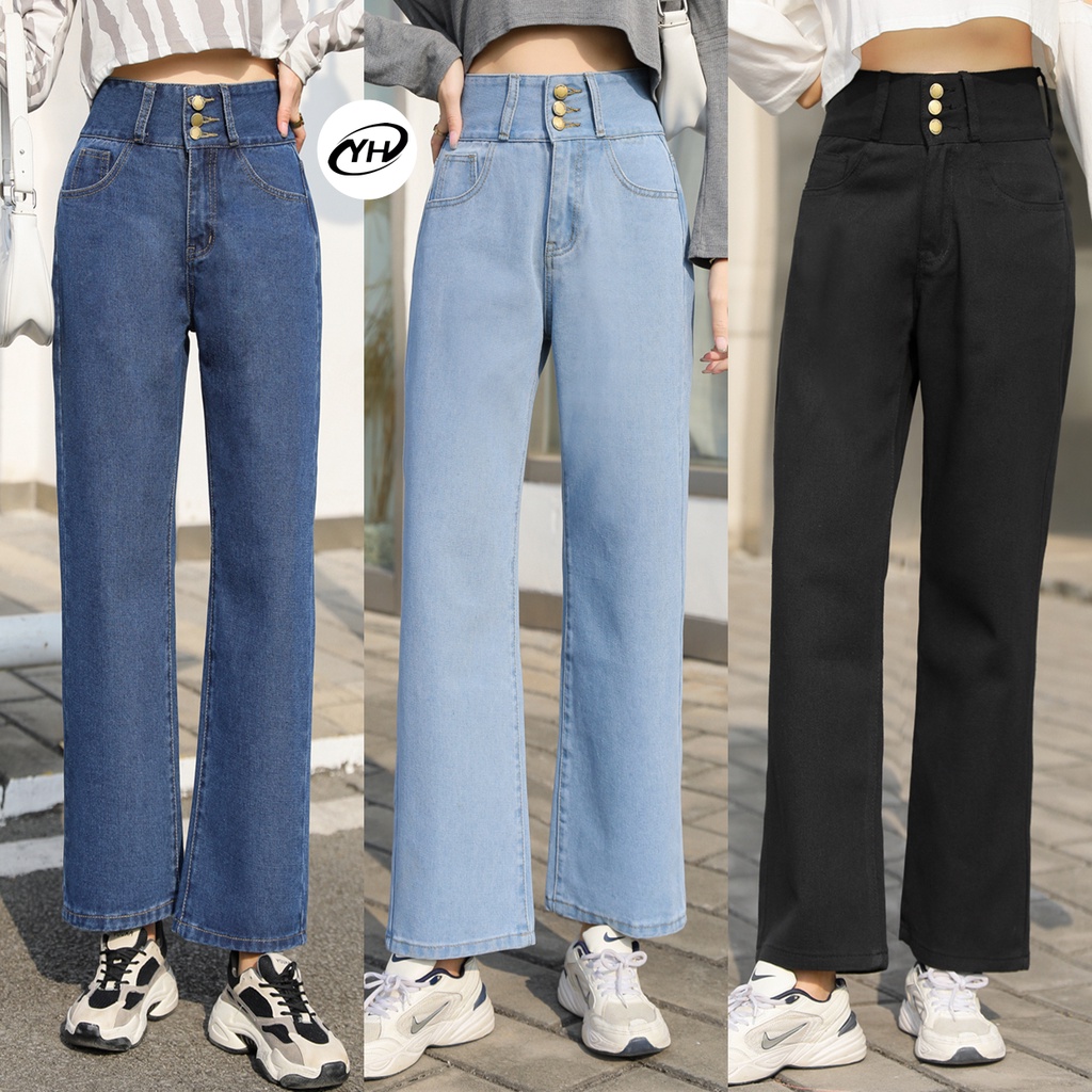 💥YH#C7211💥กางเกงยีนส์ เอวสูง สไตล์เกาหลี ทรงกระบอกใหญ่ ตกแต่งกระดุมด้านหน้า กางเกงยีนส์ขายาว สวยๆเก๋ๆ