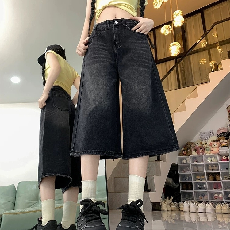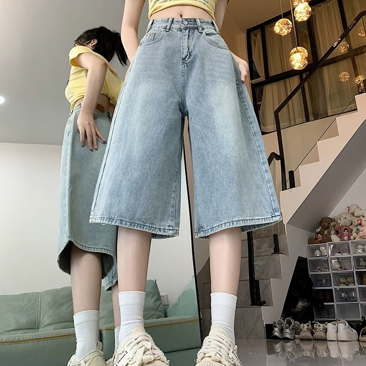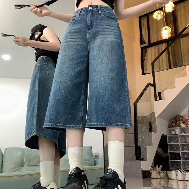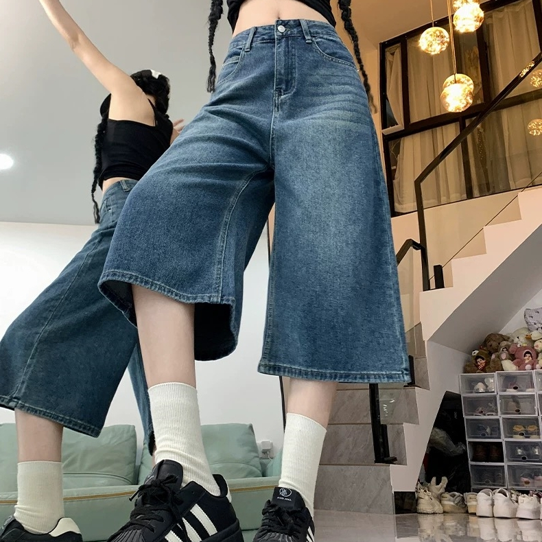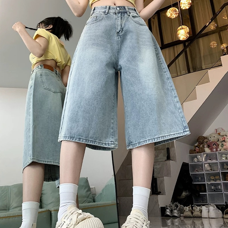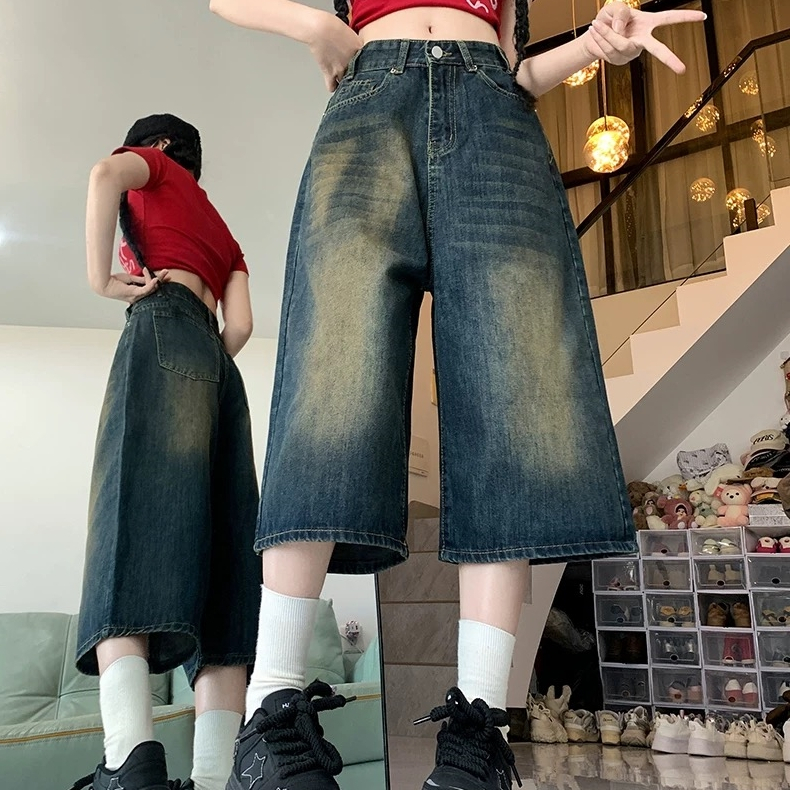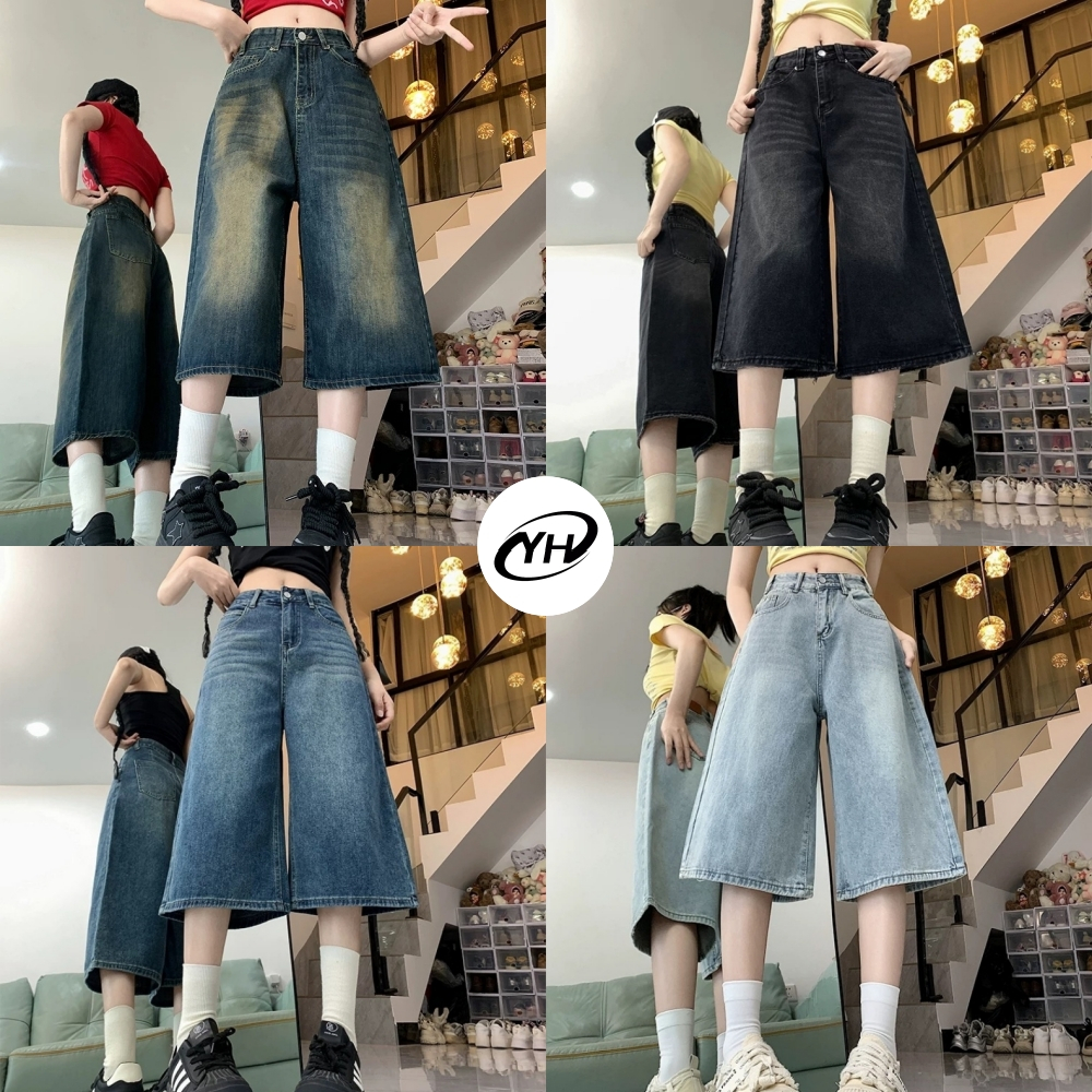 💥YH#D8125💥มีไซซ์ S-3XL💥กางเกงขากระบอก กางเกงยีนส์ขาสั้น ทรงหลวมขากว้าง เอวสูง สไตส์วินเทจ