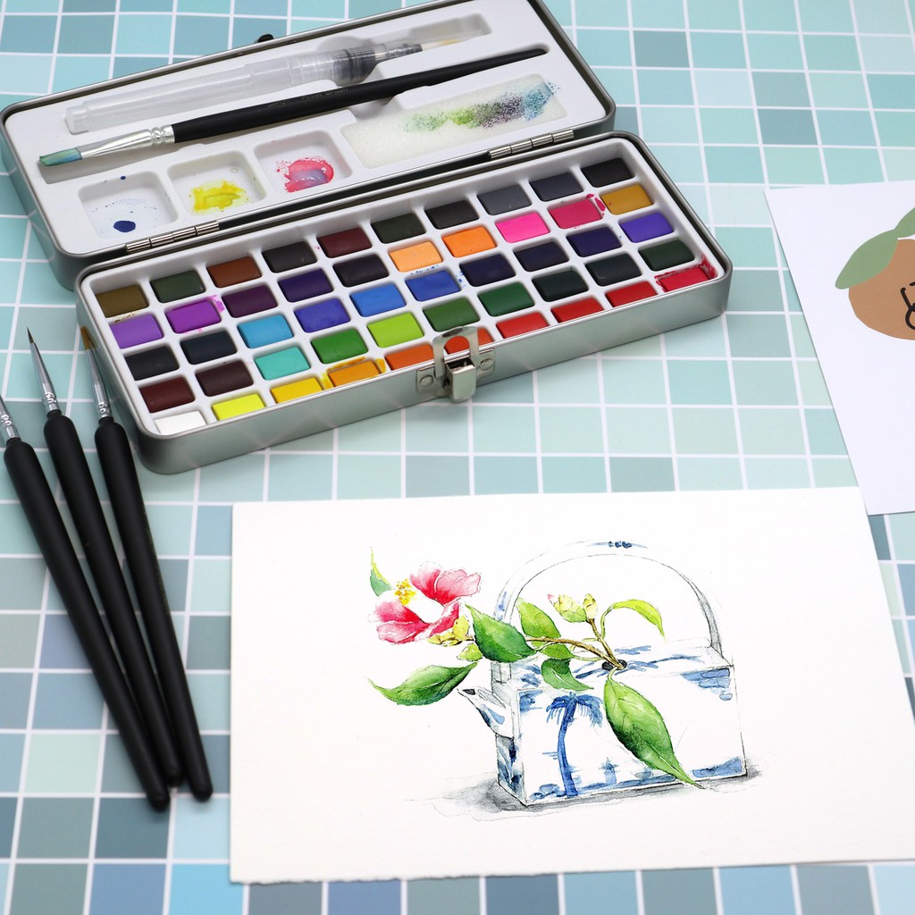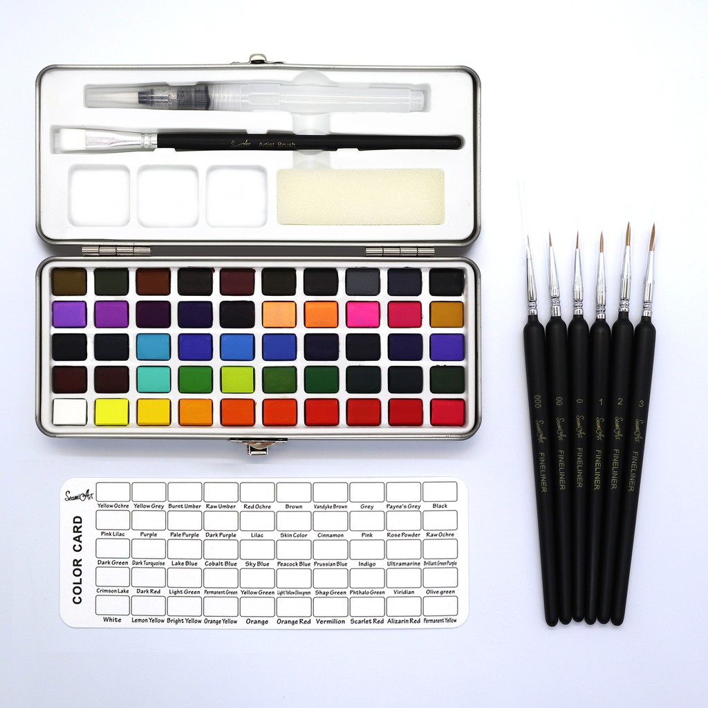 SeamiArt ชุดสีน้ำ แบบเนื้อแข็ง 50 สี พร้อมพู่กันระบายสีน้ำ 6 ชิ้น เหมาะสำหรับเป็นของขวัญ
