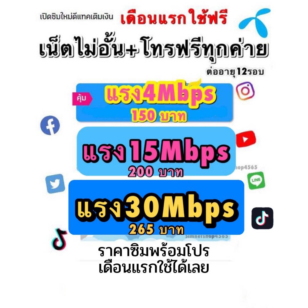 (ใช้ฟรีเดือนแรก)ดีแทค ซิมเน็ตเทพไม่ลดสปีด4mbps 15mbps 30Mb พร้อมโทรฟรีทุกค่าย