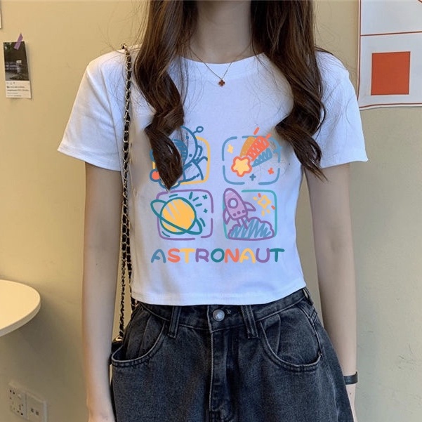 MT เสื้อยืด สไตล์เกาหลี สายคาเฟ่ โอเวอร์ไซส์แขนสั้นสีขาว ลายการ์ตูน คอกลม สตรีท เสื้อยืดผู้หญิง