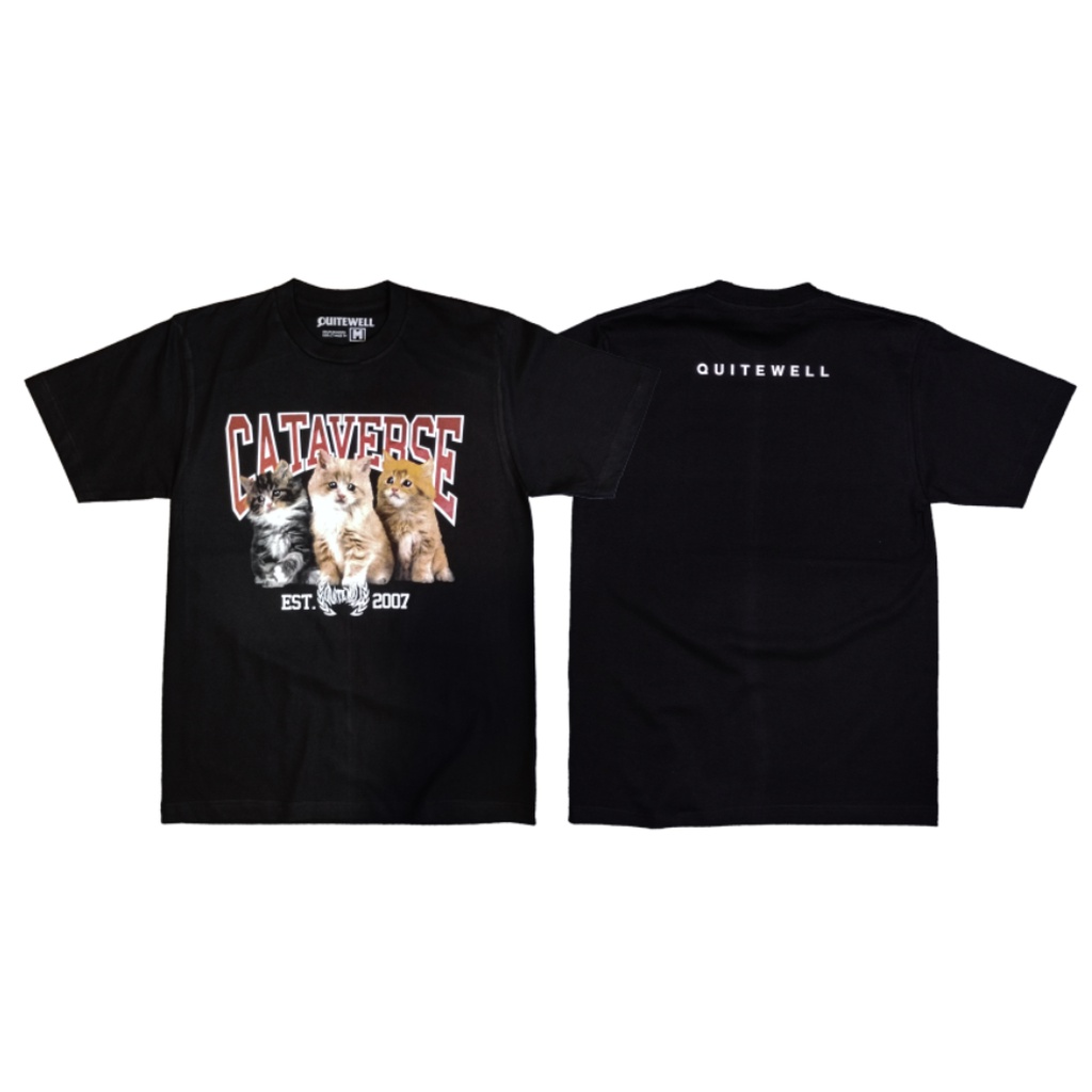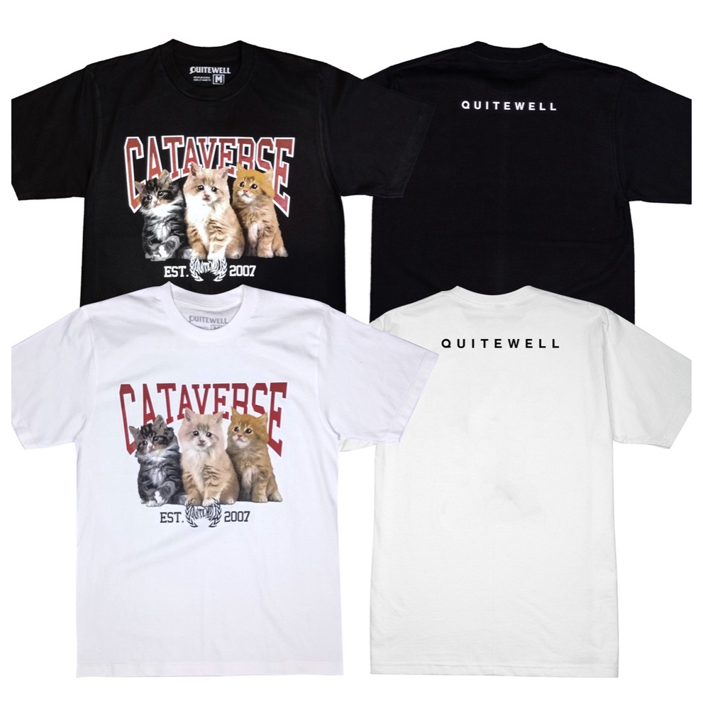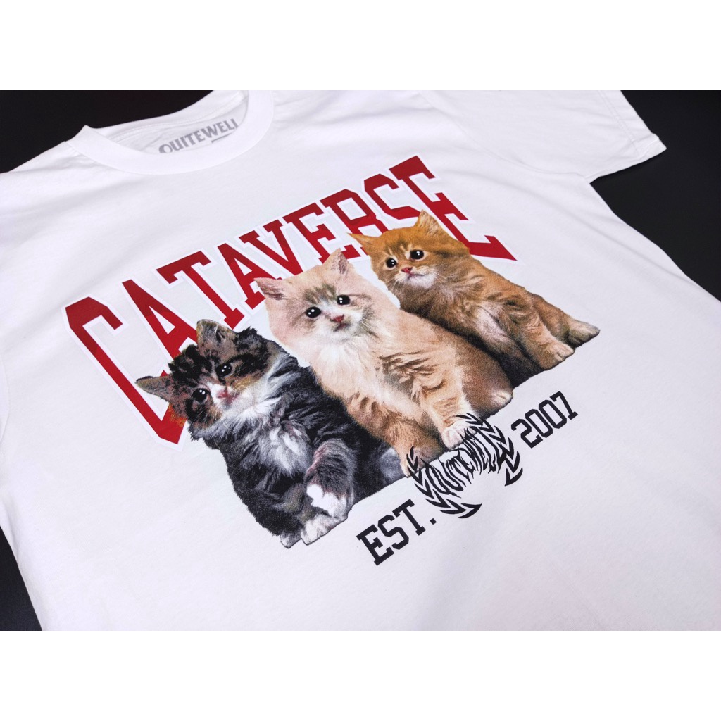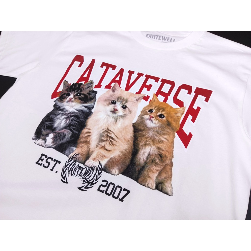 QUITEWELL เสื้อยืดแขนสั้น 194 CATAVERSE เสื้อผู้ชาย Oversize ลายแมว สีดำ สีขาว วินเทจ