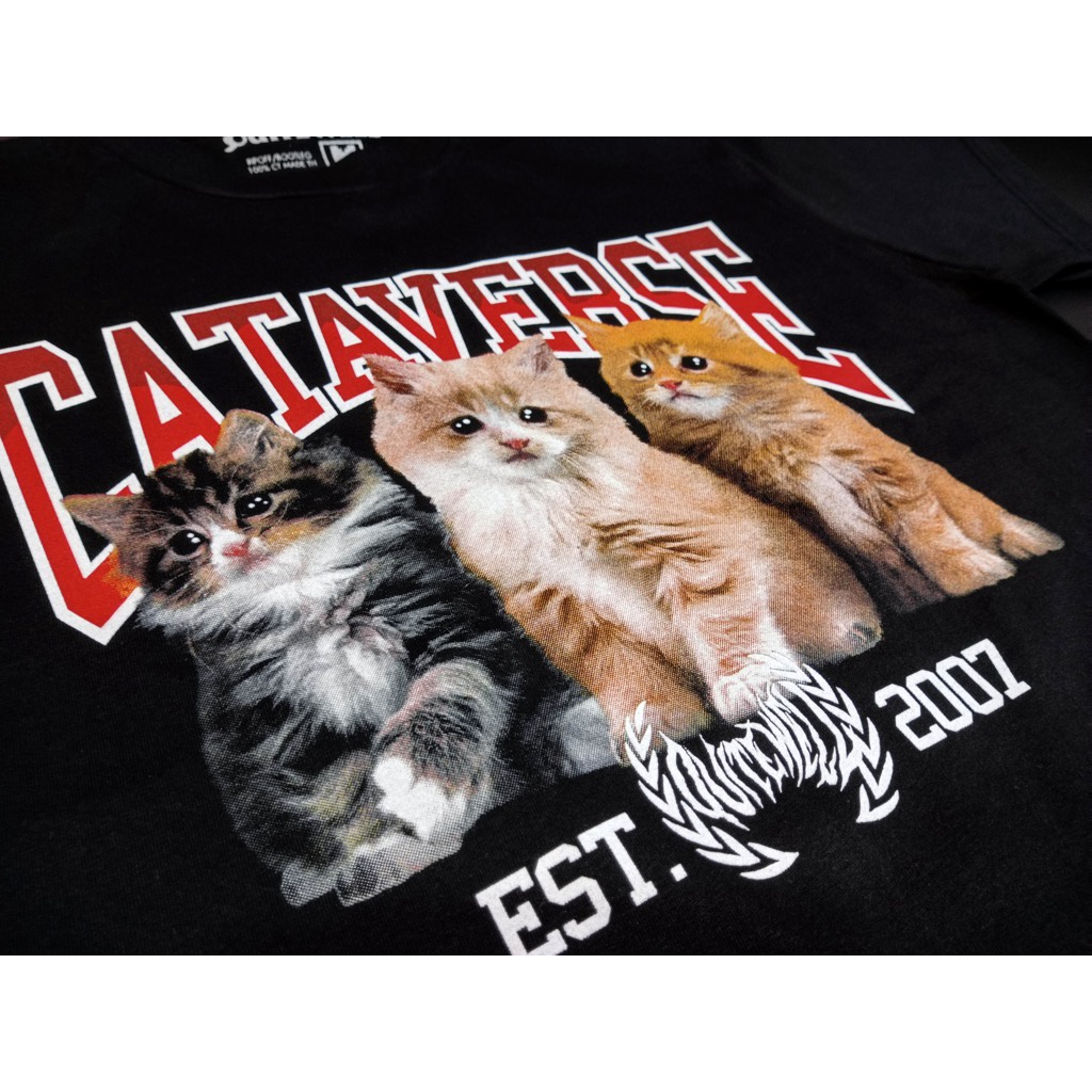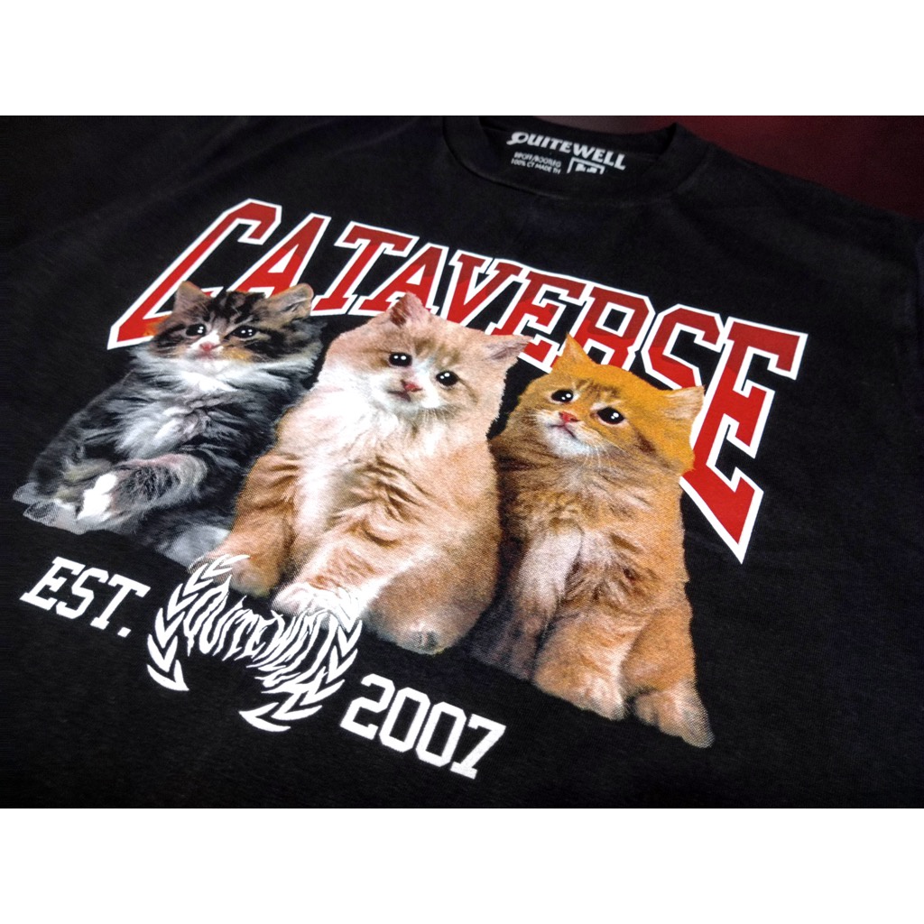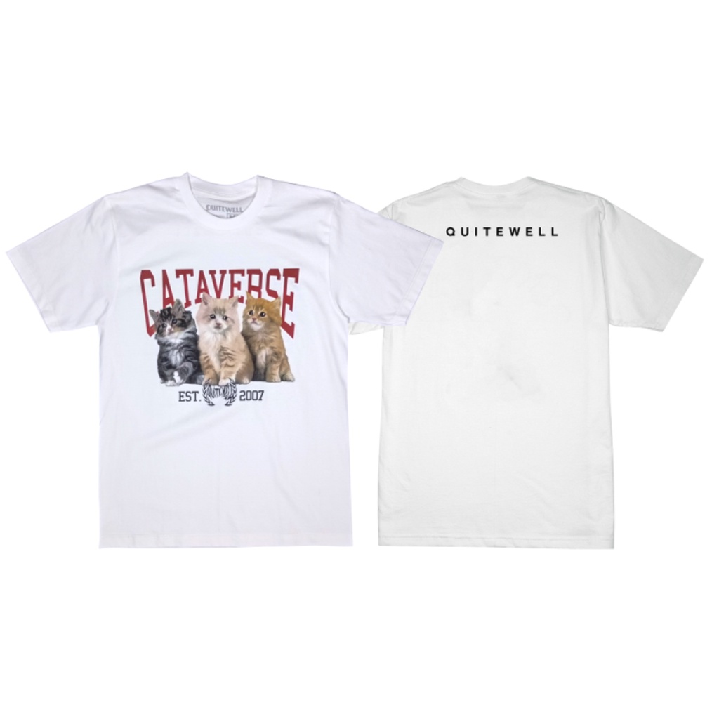 QUITEWELL เสื้อยืดแขนสั้น 194 CATAVERSE เสื้อผู้ชาย Oversize ลายแมว สีดำ สีขาว วินเทจ