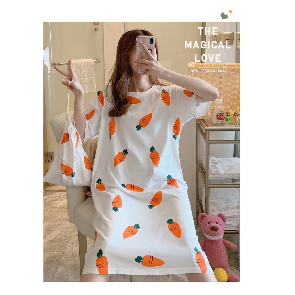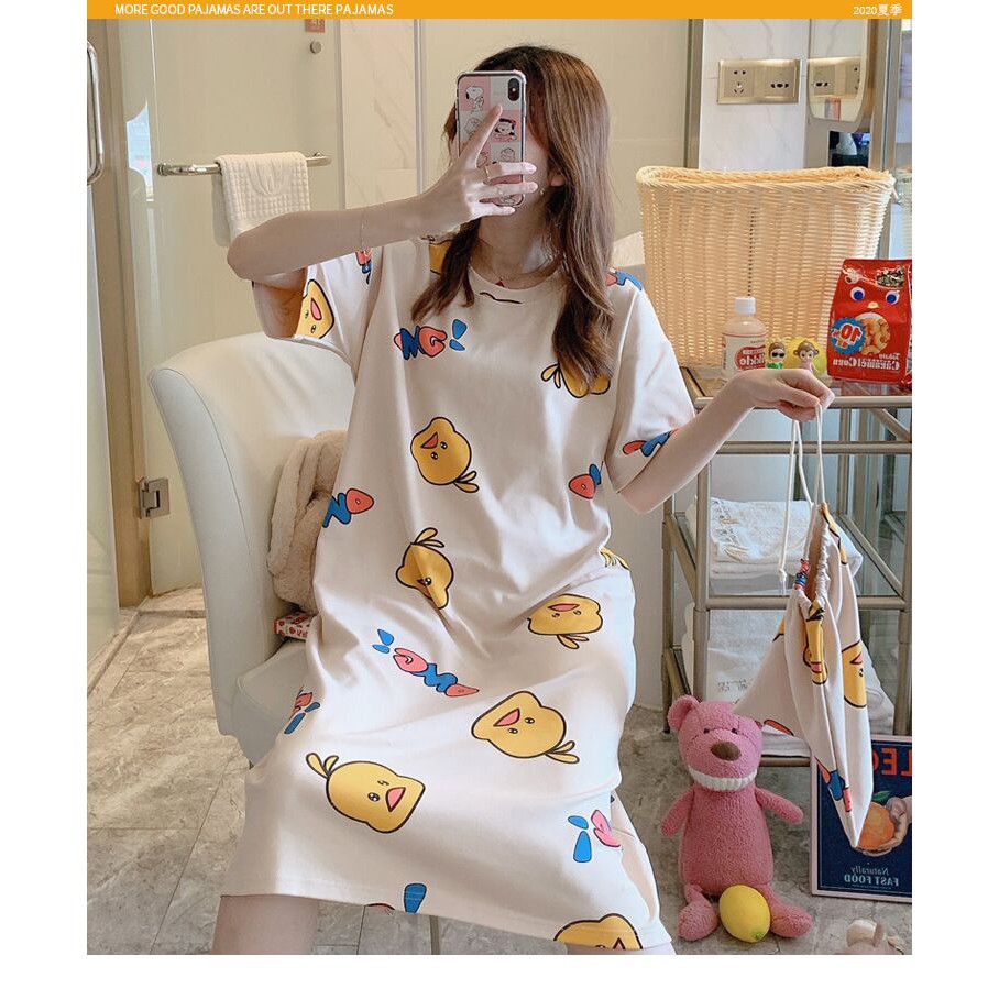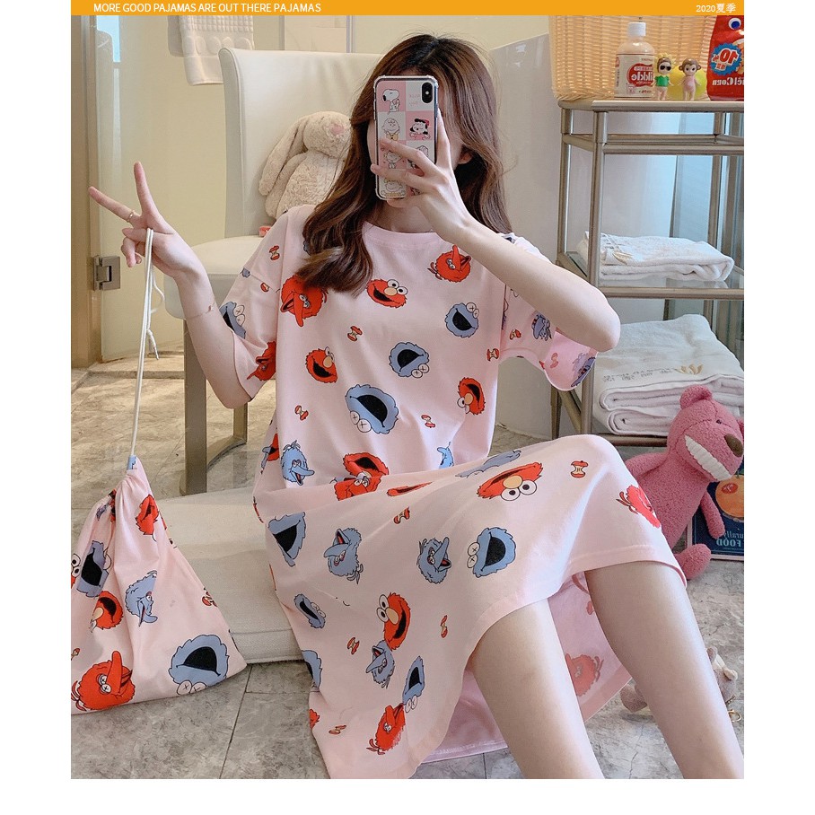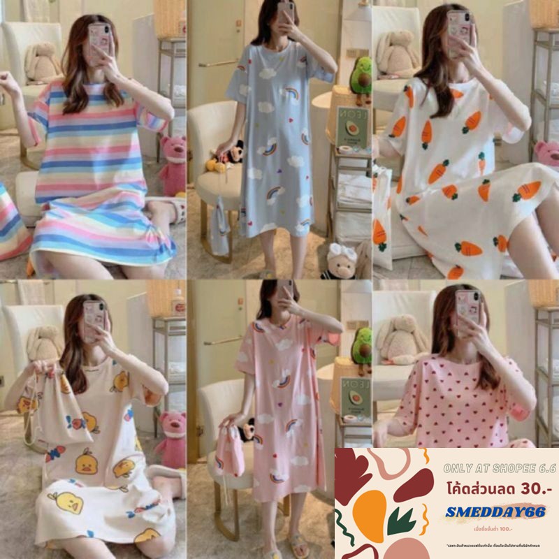 ชุดนอนกระโปรง คอกลมเดรส เนื้อนุ่มคุณภาพสูง ลายน่ารักมีถุงผ้าให้ทุกชุด ผ้าคอตตอน กระโปรงแขนสั้น