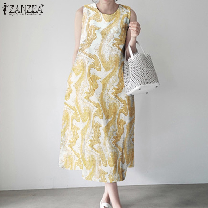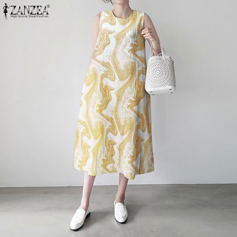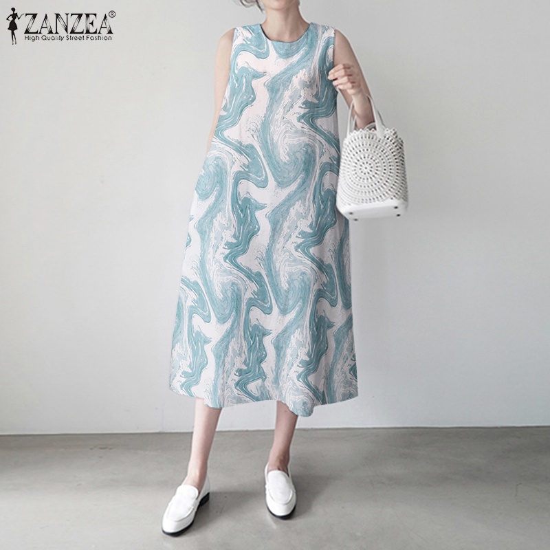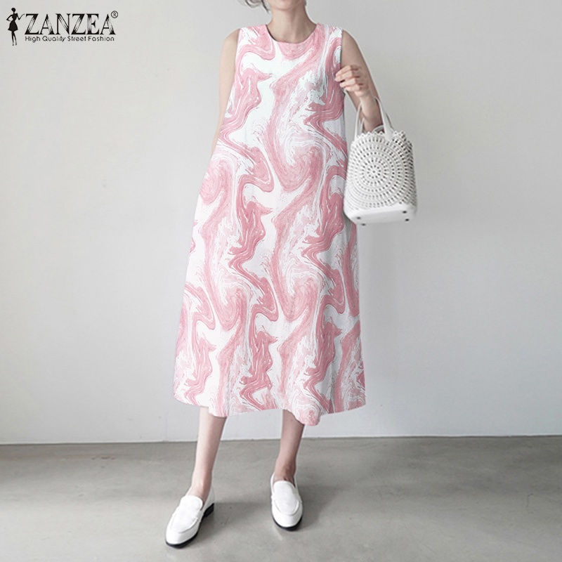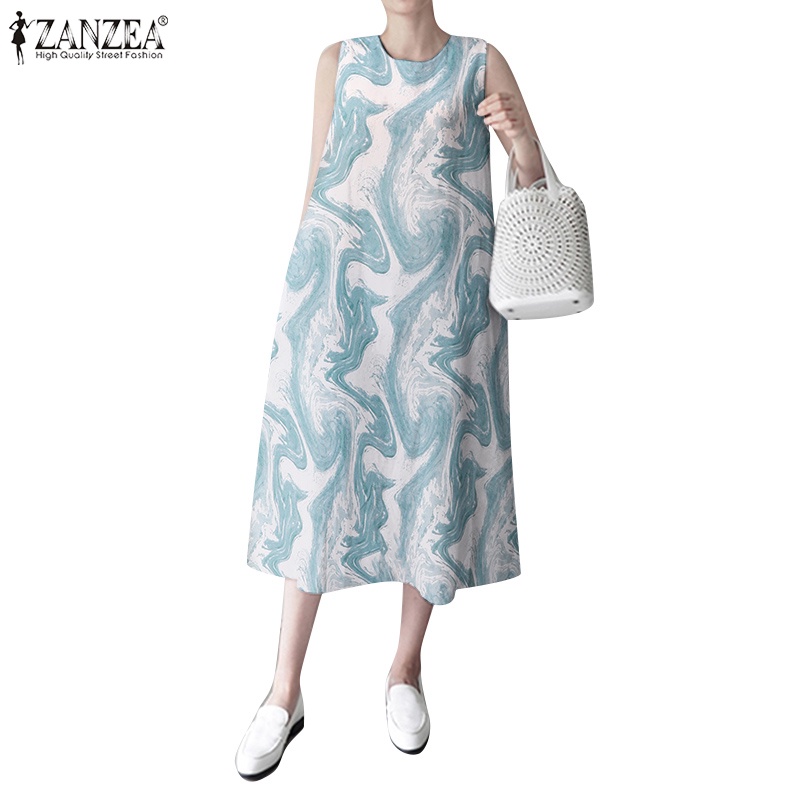 Zanzea ชุดมิดิเดรส คอกลม แขนกุด พิมพ์ลายหยัก มีซิปด้านหลัง มีกระเป๋าด้านข้าง สําหรับผู้หญิง