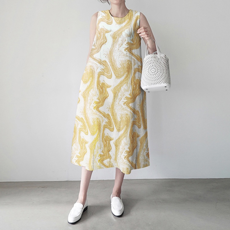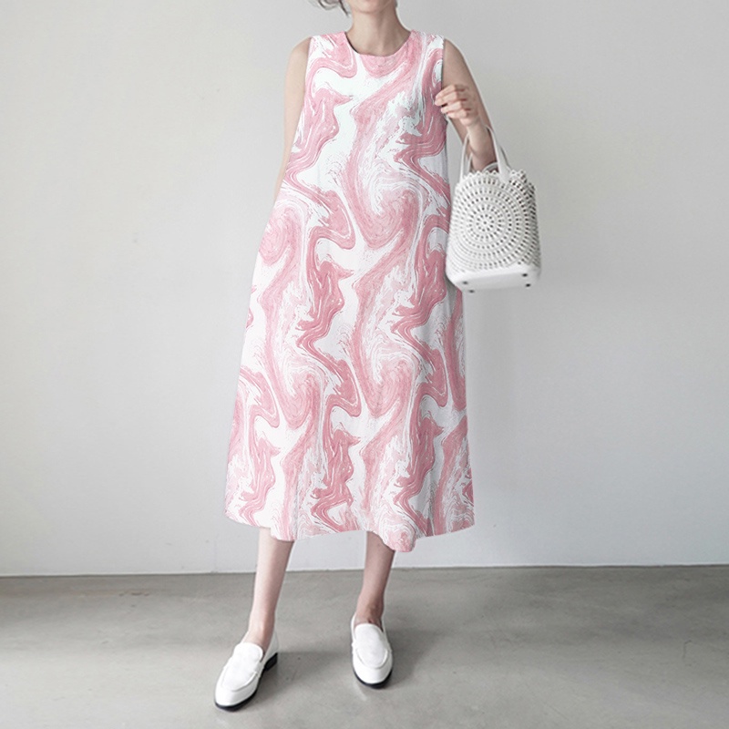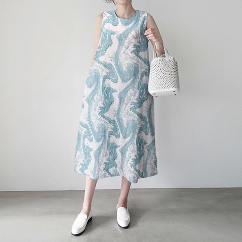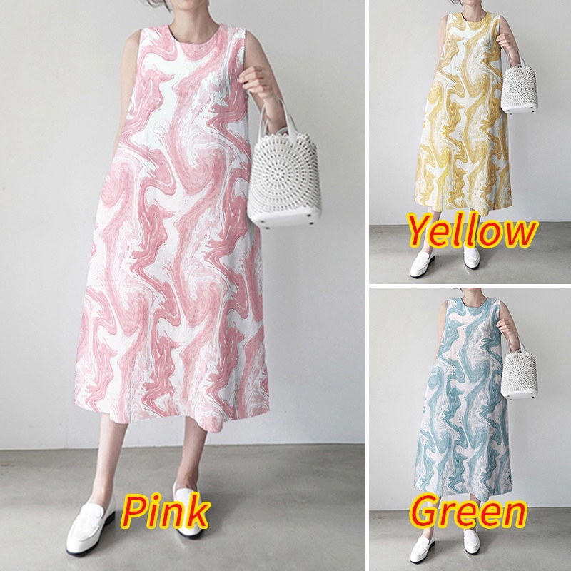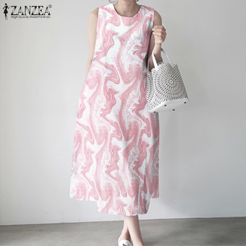 Zanzea ชุดมิดิเดรส คอกลม แขนกุด พิมพ์ลายหยัก มีซิปด้านหลัง มีกระเป๋าด้านข้าง สําหรับผู้หญิง