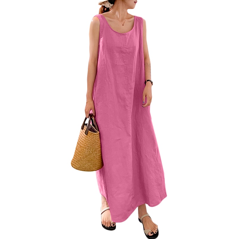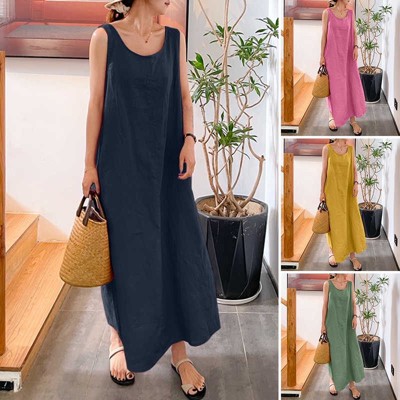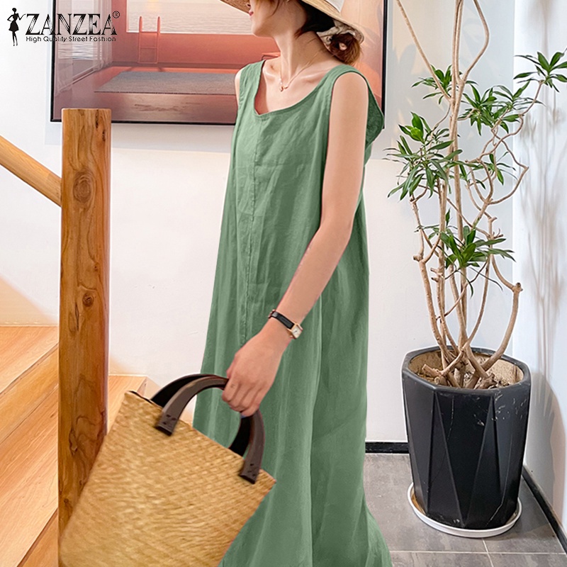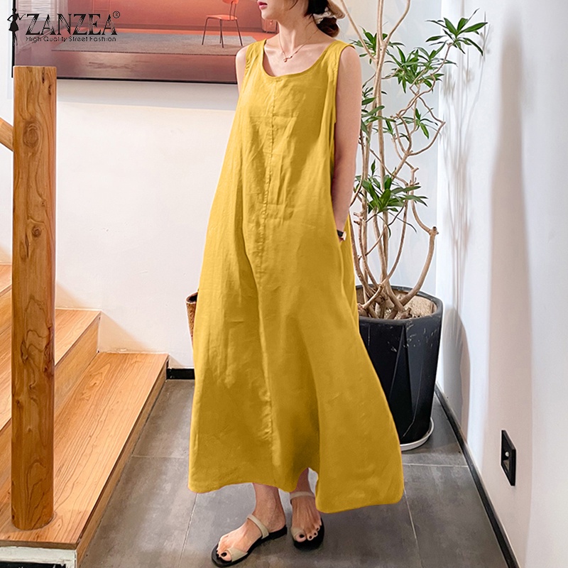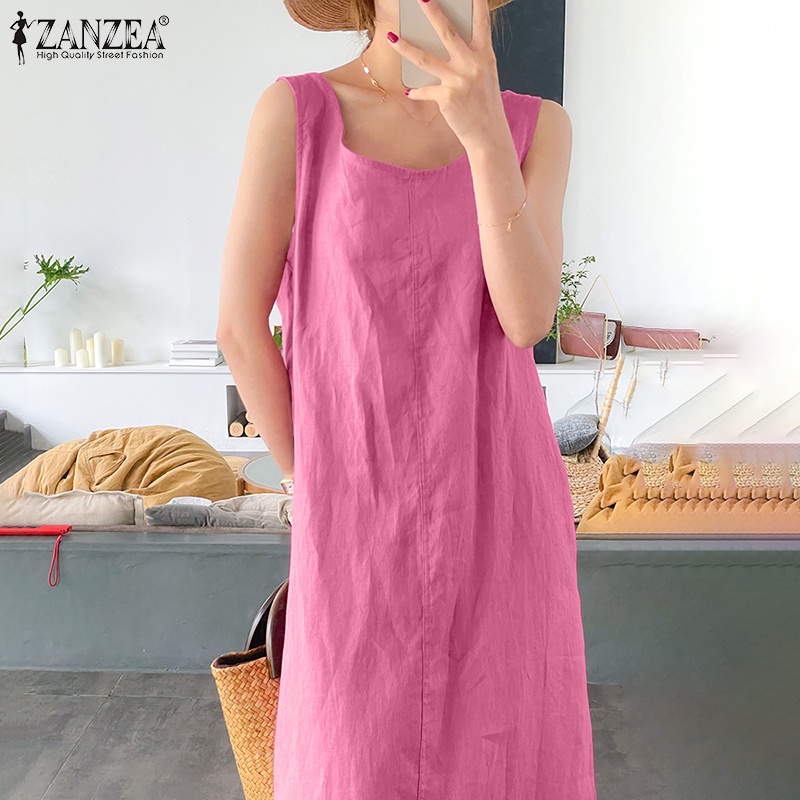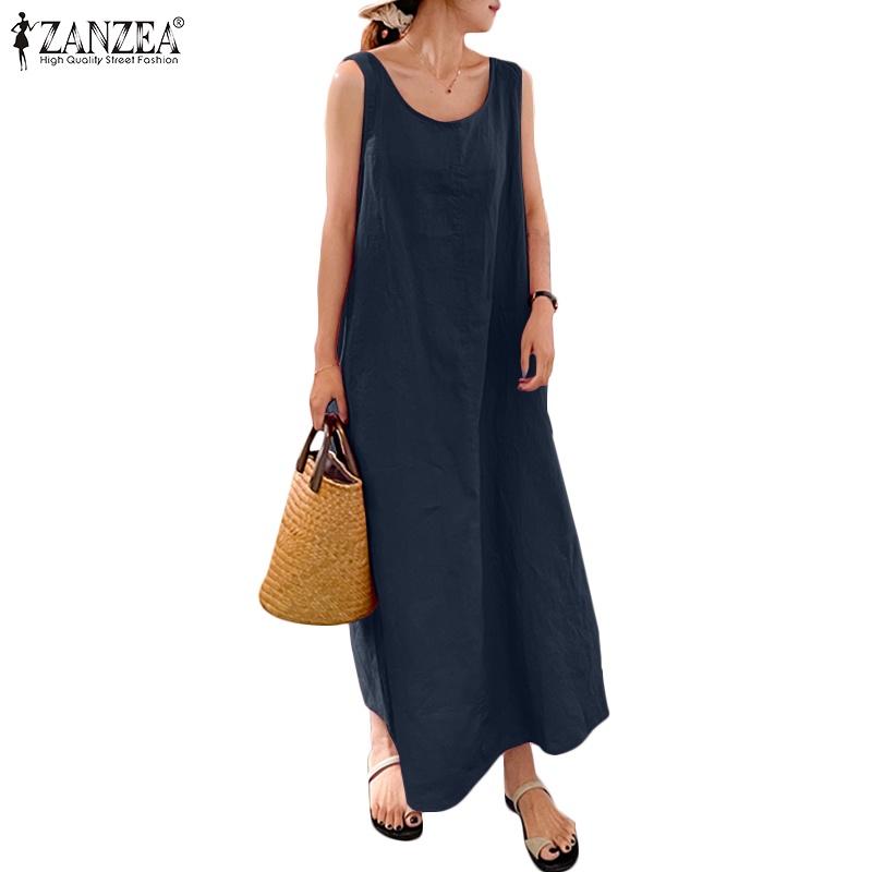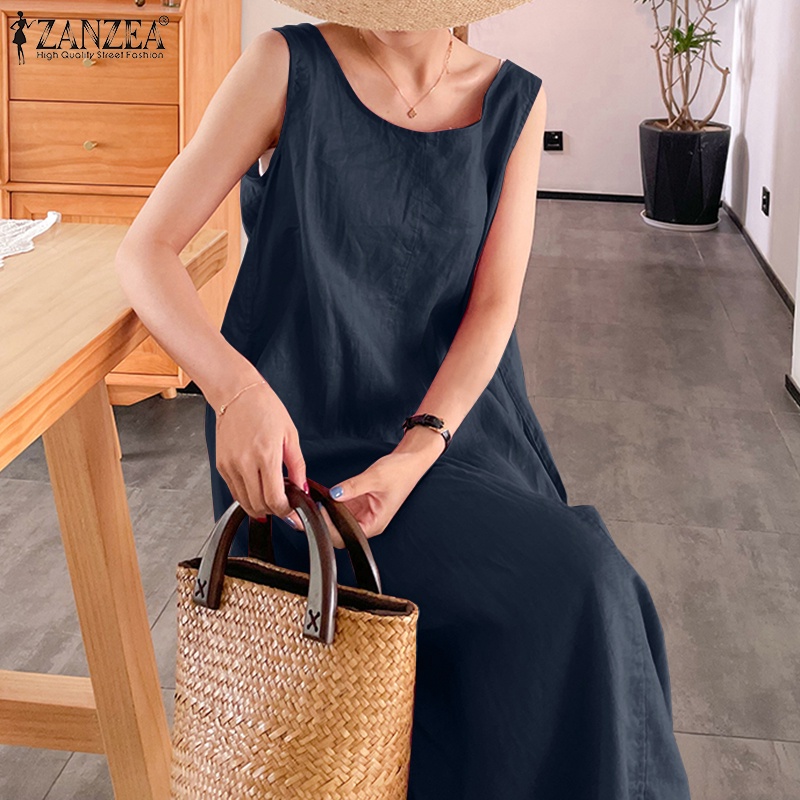 ZANZEA ใส่ ซานเซีย ผู้หญิงเกาหลีถนนที่เรียบง่ายสบายๆผ้าฝ้าย โอ-คอแขนกุดแข็งทุกการแข่งขันเสื้อกั๊กชุดยาว