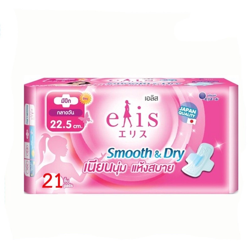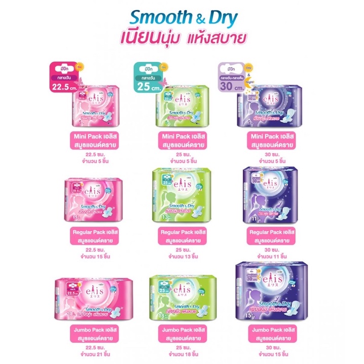 ผ้าอนาม ัย Elis smooth & dry เอลิส สมูทแอนด์ดราย ผ้าอนามัยแบบมีปีก Sanitary Pad 22.5 cm. / 25 cm. / 30 cm.