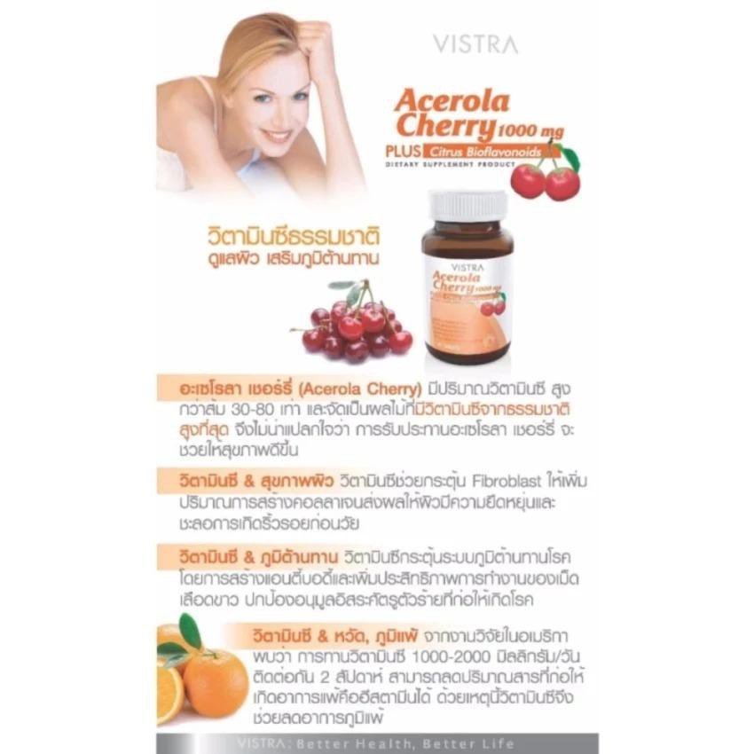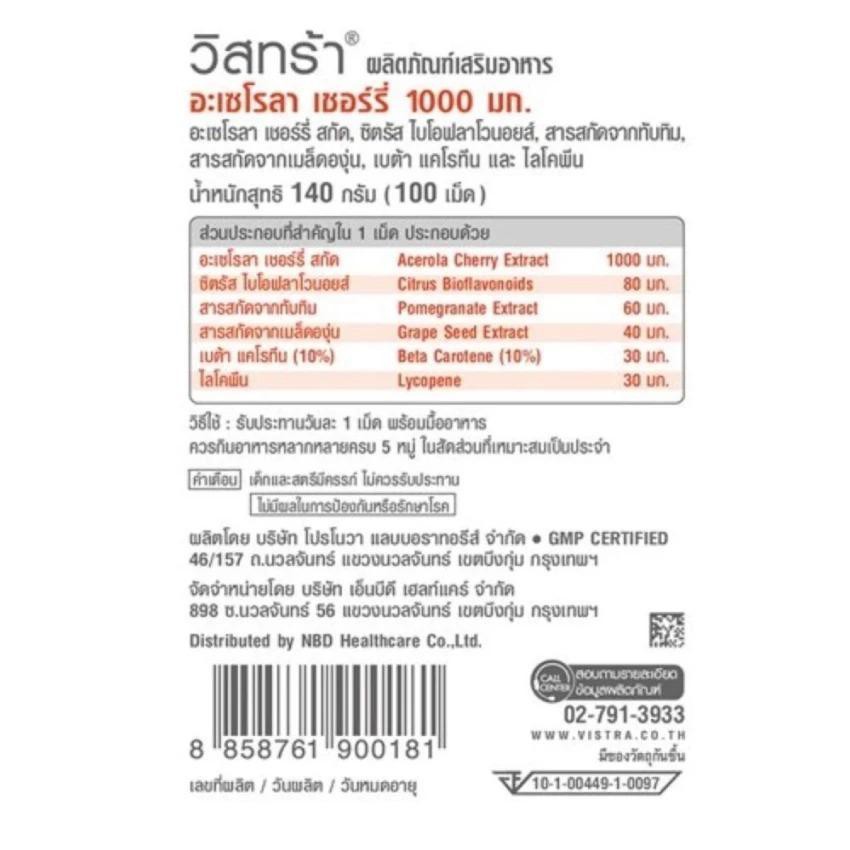 Vistra Acerola Cherry 1000 mg. วิสทร้า อะเซโรล่า เชอร์รี่ 100 เม็ด/ขวด