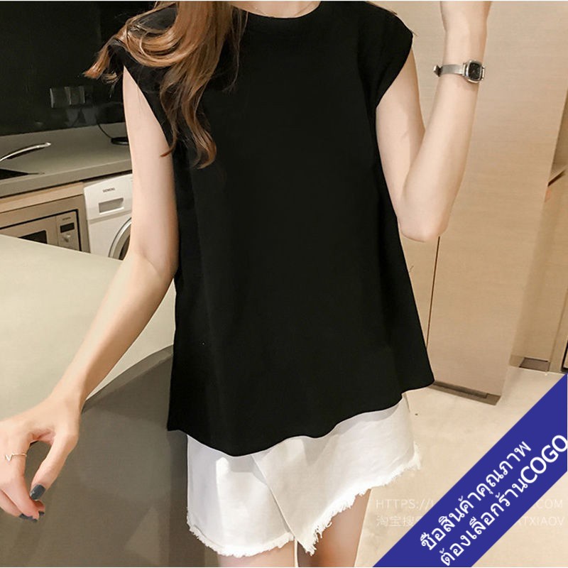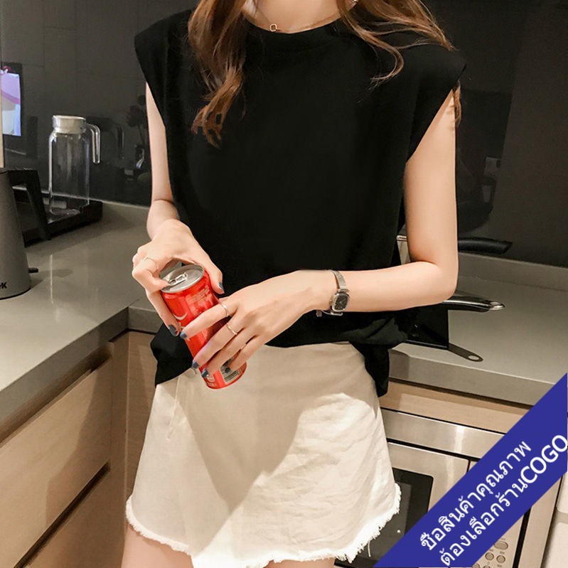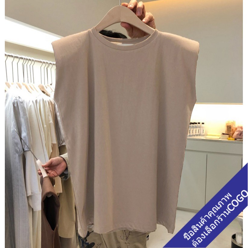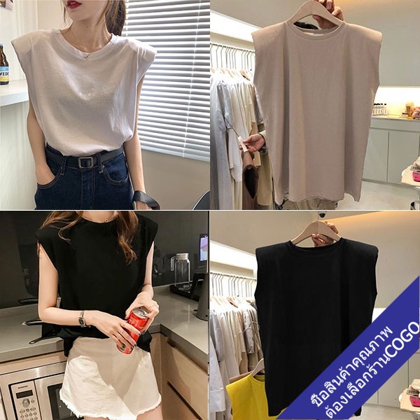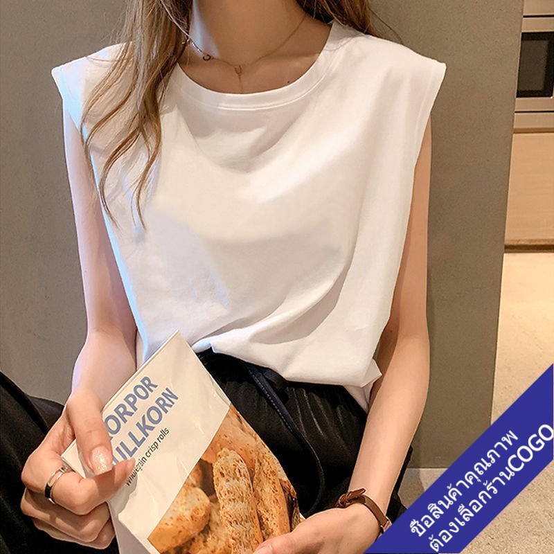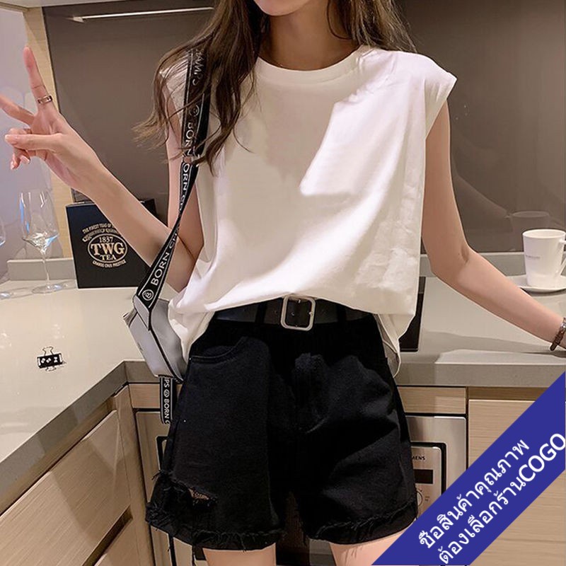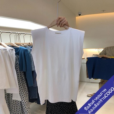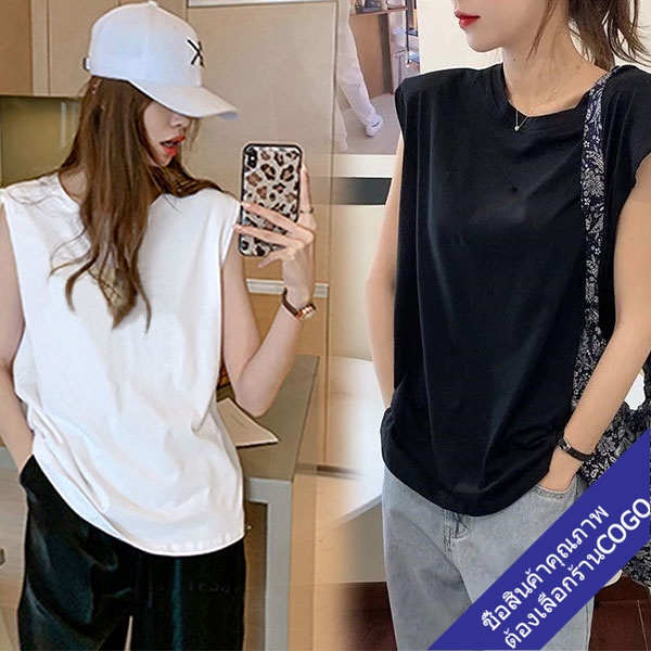 COGOเสื้อยืดแขนกุดผู้หญิงสีขาว ผ้าคอตตอน100% สีพื้น Oversize เสื้อผ้าแฟชั่นวัยรุ่น เสื้อเสริมบ่า สไตล์เกาหลี สวยใส่สบาย