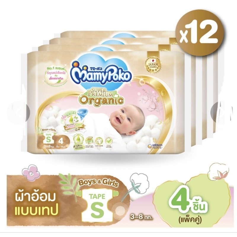 Mamy Poko มามี่โพโกะ ซุปเปอร์ พรีเมี่ยม ออแกรนิค ผ้าอ้อมเด็กแบบเทป ไซส์ NB,S แพ็ค 12 คู่