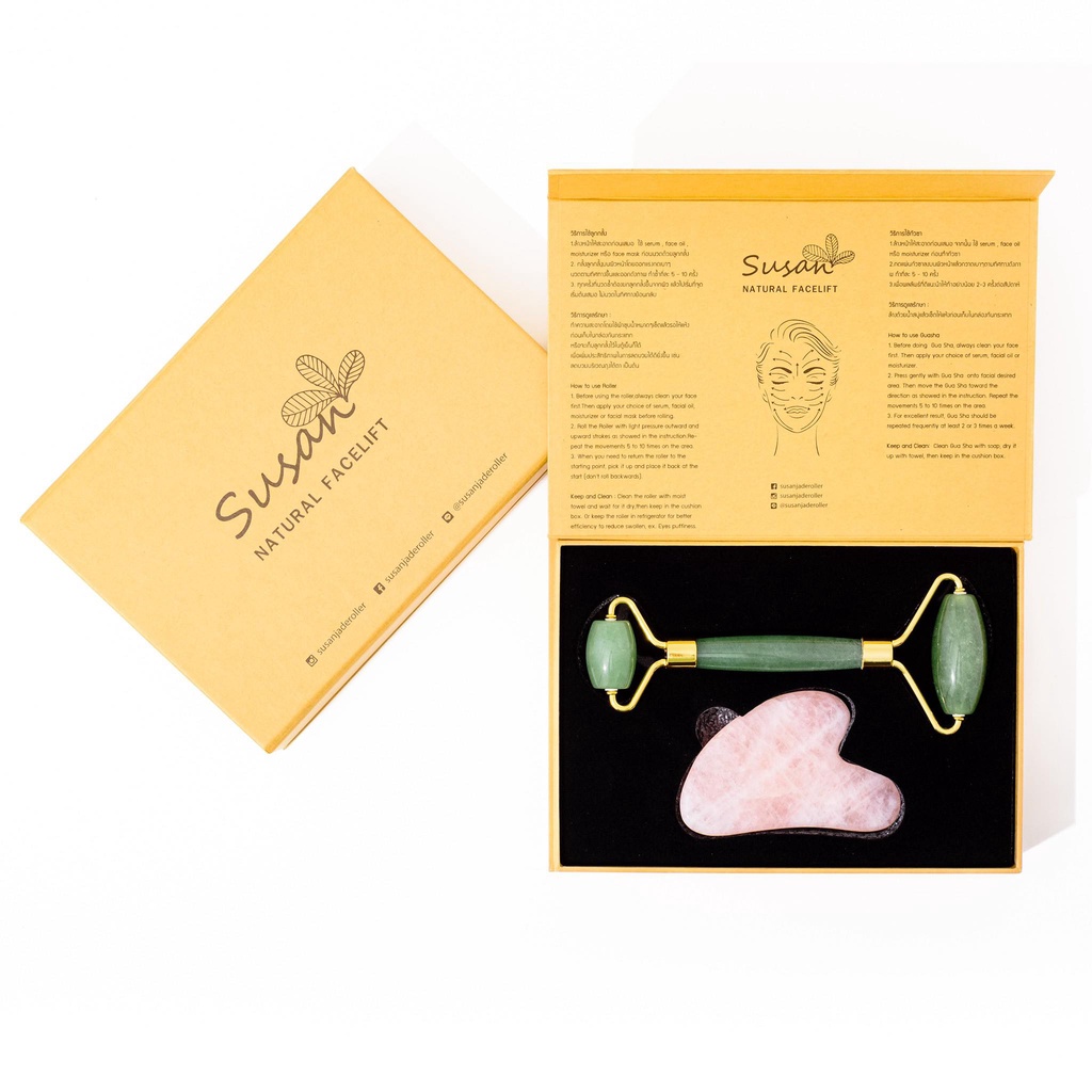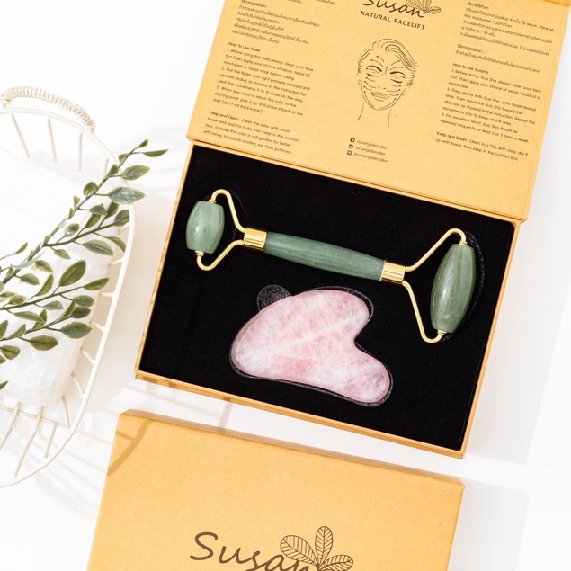 เซ็ทลูกกลิ้งหยก+กัวซาโรสควอตซ์ นวดหน้า หินธรรมชาติแท้100%ไร้สารเคมี ลดริ้วรอย ยกกระชับ หน้าใส