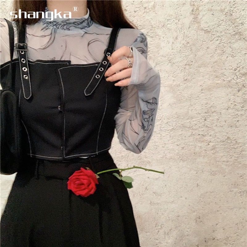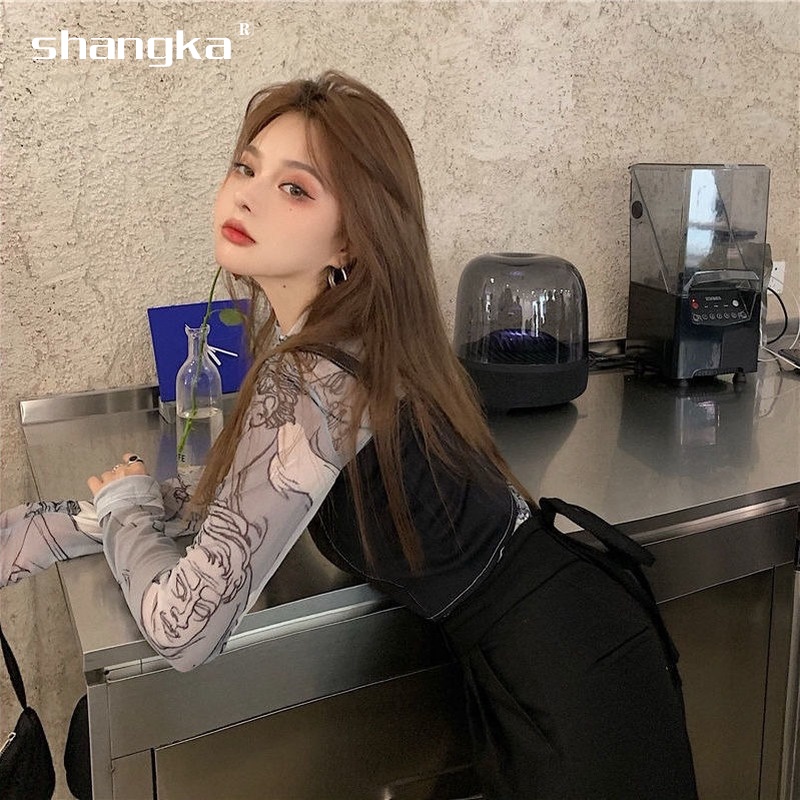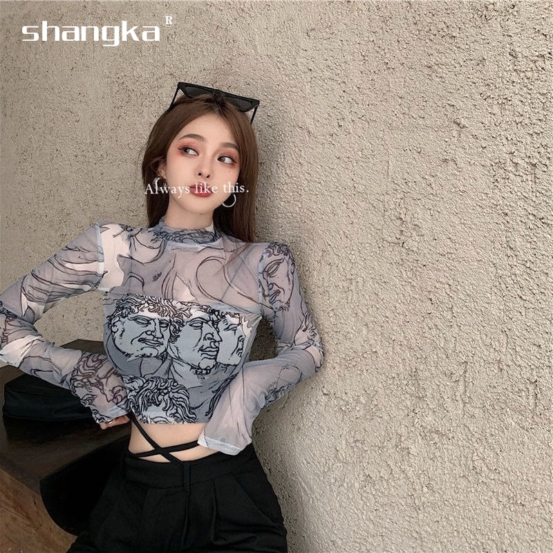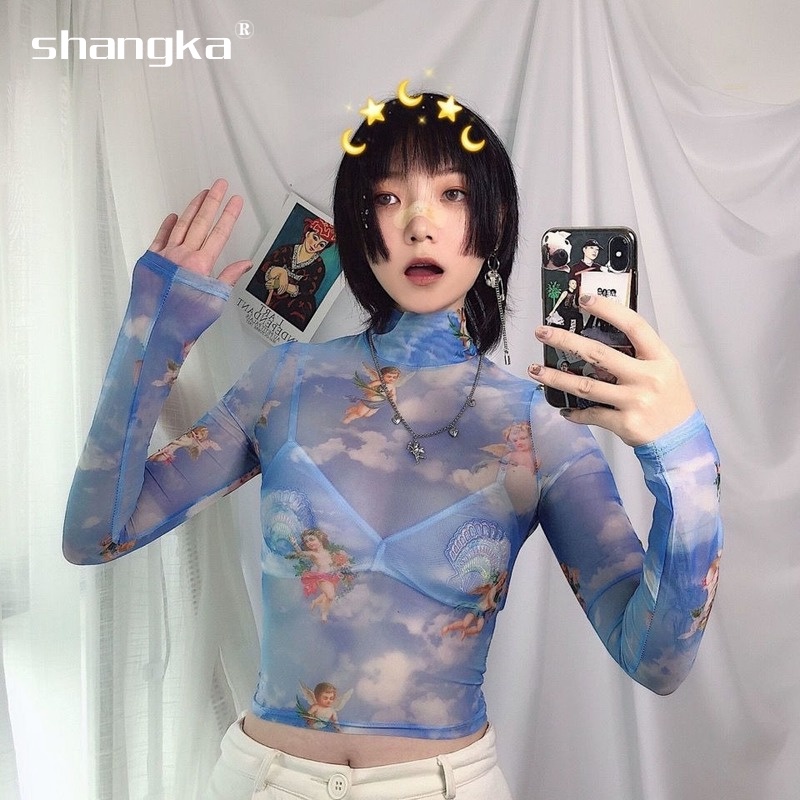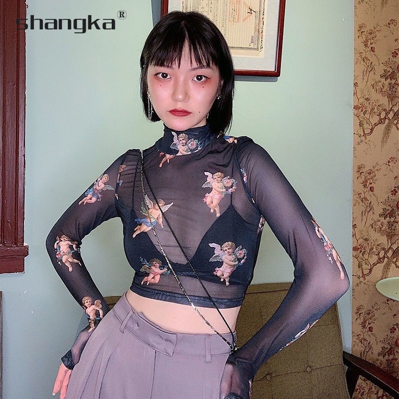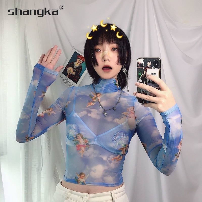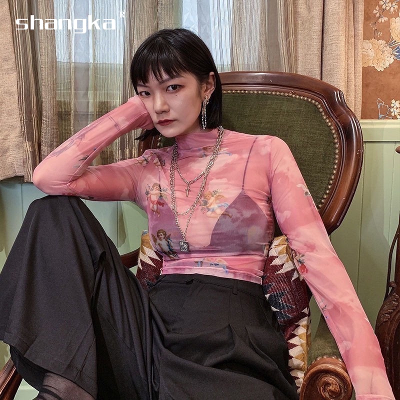 เสื้อยืดสตรีแขนยาวคอเต่าผ้าตาข่ายซีทรู เสื้อรัดรูปเซ็กซี่พอดีตัว
