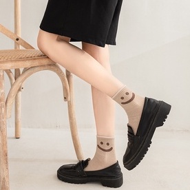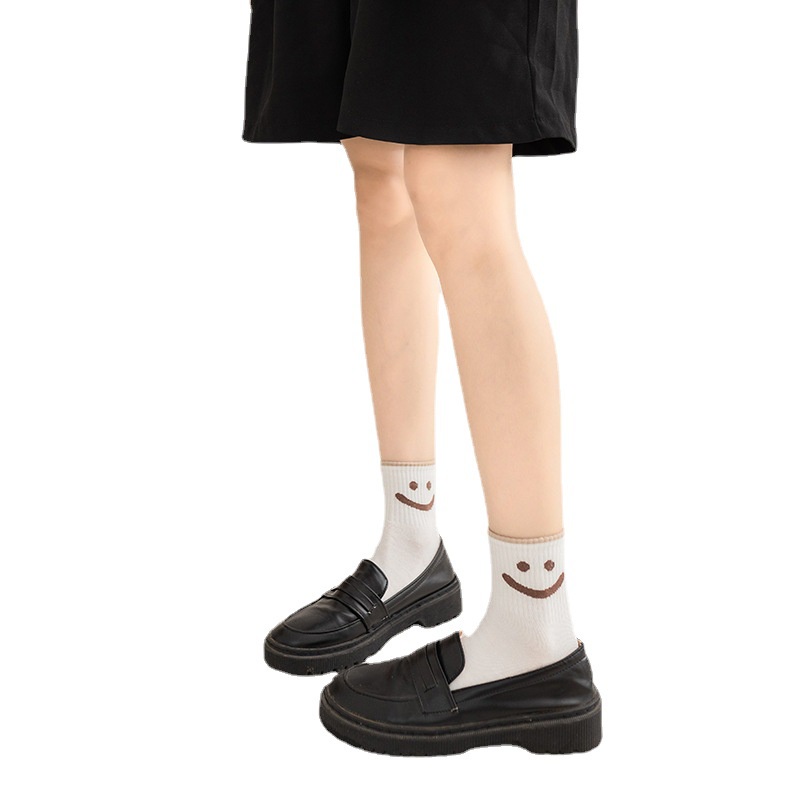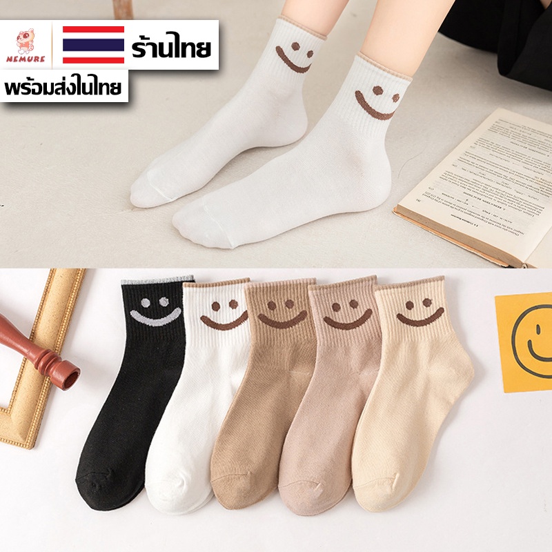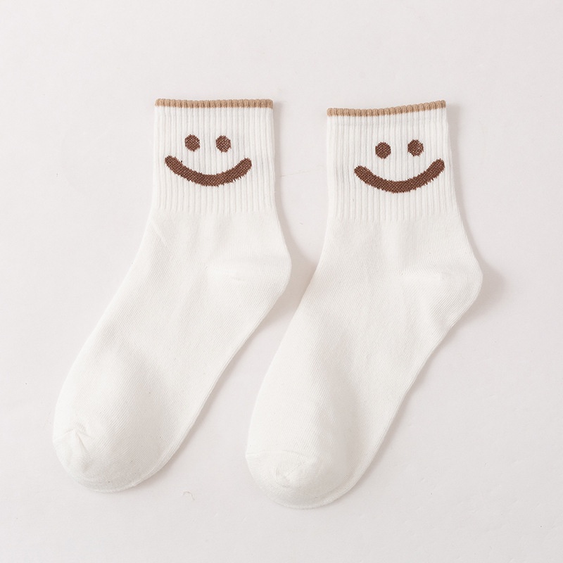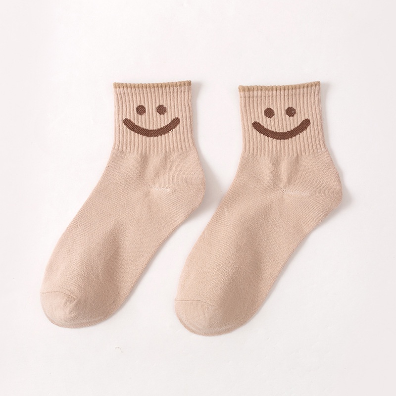 (W-135)ส่งเร็วพร้อมส่งในไทย ถุงเท้าข้อกลางสกีนข้อลายหน้ายิ้ม Earth tone