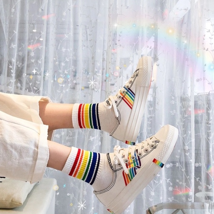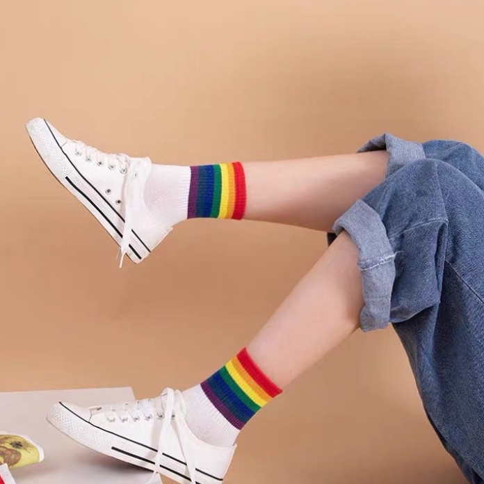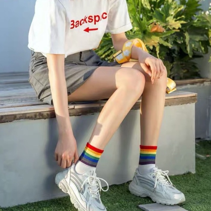 (W-164) ถุงเท้าข้อกลาง คาดแถบสีรุ้ง ถุงเท้าแฟชั่นลายสายรุ้ง 🌈 Rainbow socks เนื้อผ้าดี ใส่สบาย