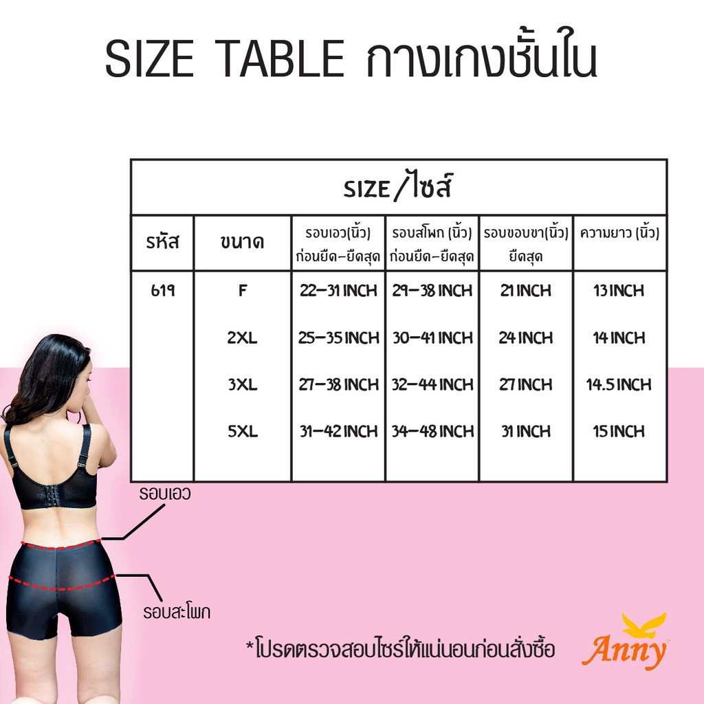 กางเกงซับในกางเกงกันโป๊ Anny รุ่น619 แบบขาสั่น ขอบยางยืดหยุ่น เนื้อผ้าลื่นนุ่มส่วมใส่สบายไม่อึดอัด มีไซร์F-2XL-3XL-5XL