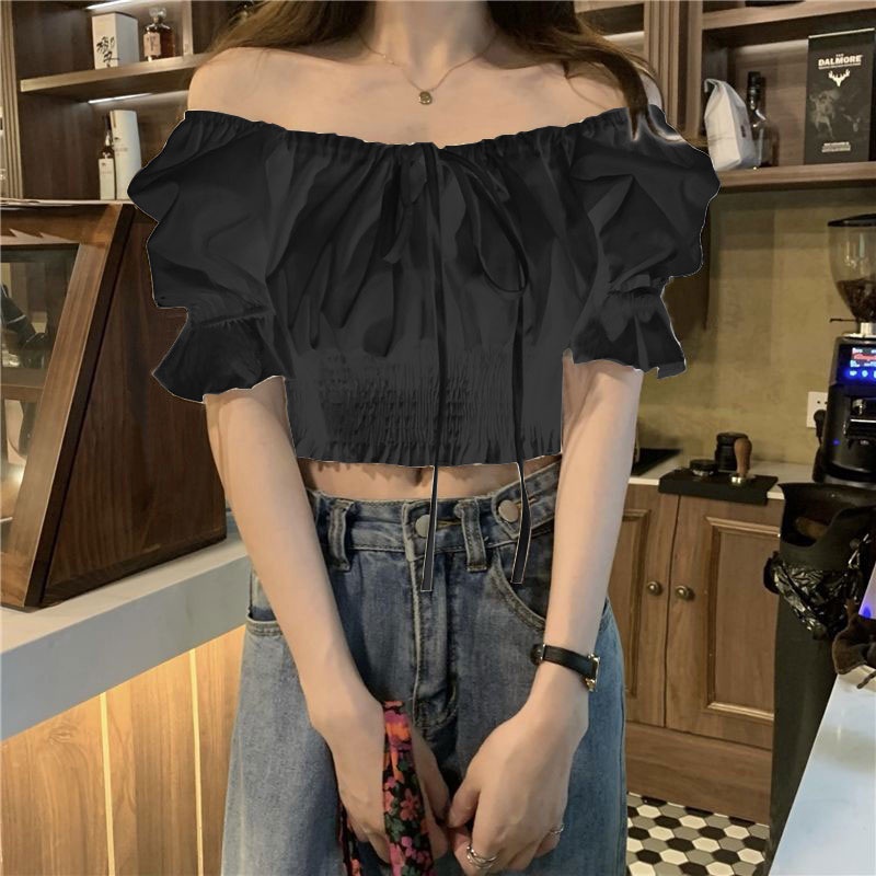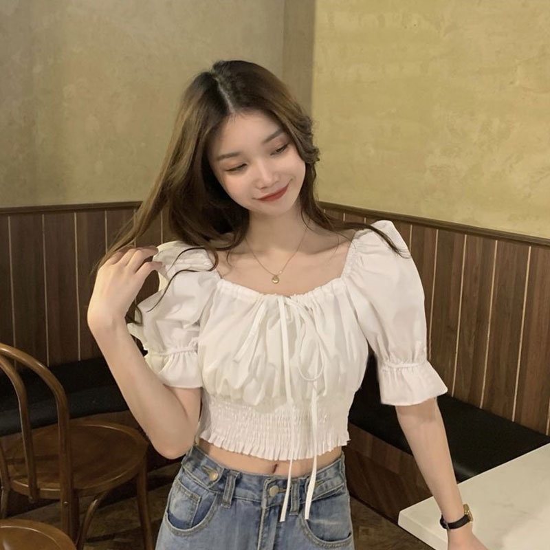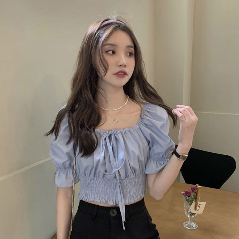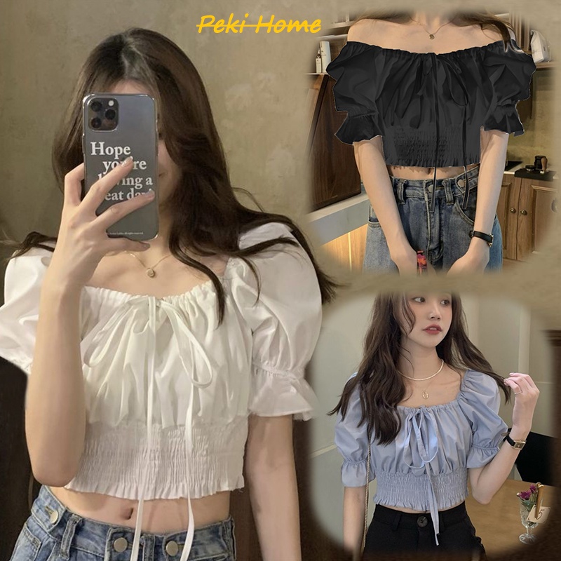 มาใหม่เสื้อครอปเอวลอยเเขนตุ๊กตาผูกโบว์ สีพื้นผ้าลื่น งานสม็อคเอว มี3สีไห้เลือก