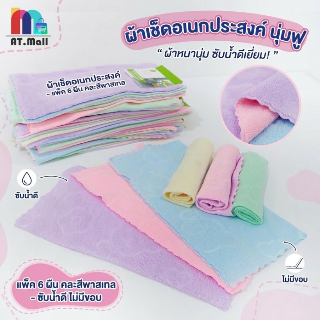AT.MALL ผ้าเช็ดอเนกประสงค์ ผ้าเช็ดหน้า ขนเป็ด นุ่มฟู แพ็ค 6 ผืน คละสี พาสเทล ขนาด 30x30 ซม. ซับน้ำดี ไร้ขอบ รุ่น 205-6
