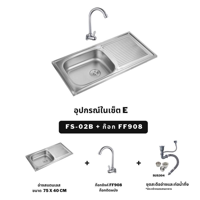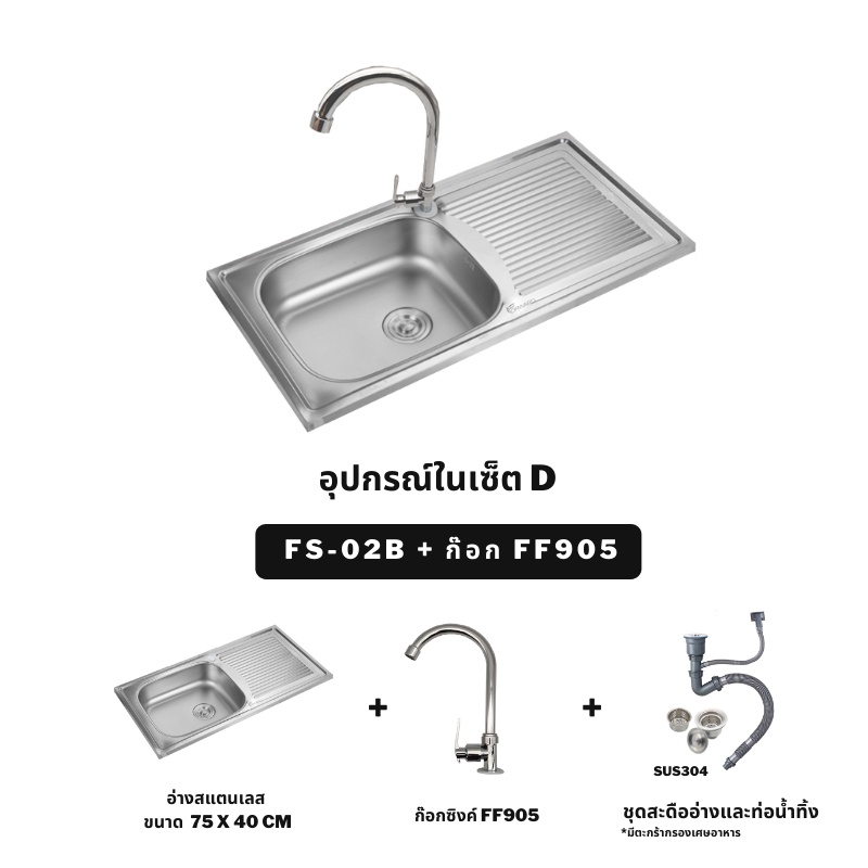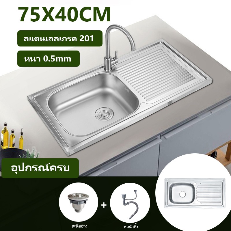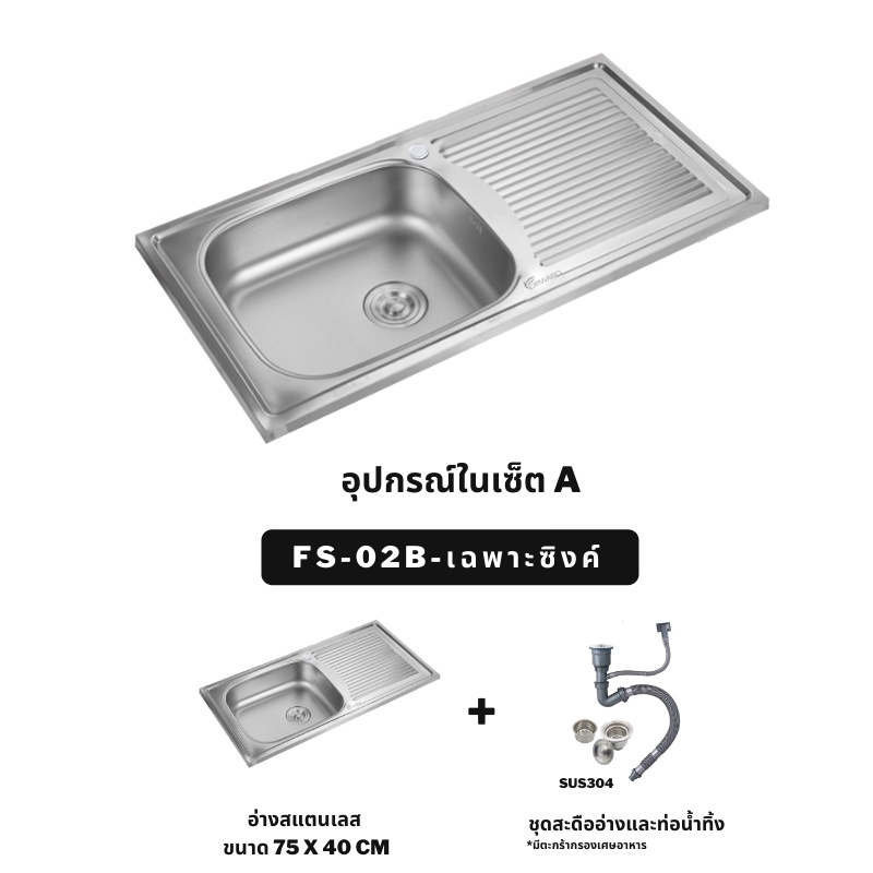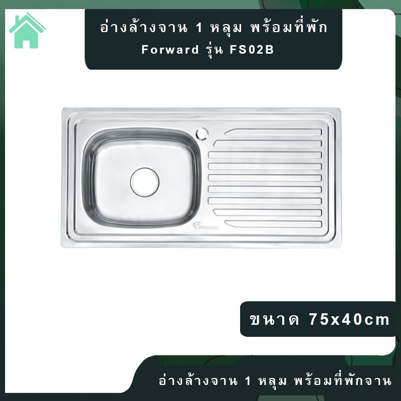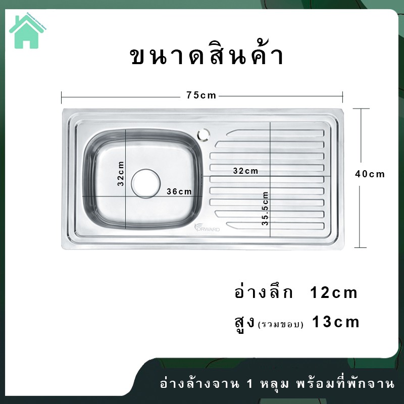 ซิงค์ล้างจาน อ่างล้างจาน 1หลุมพร้อมที่พักจาน วัสดุสแตนเลส ขนาด75x41ซม. Stainless steel sink รุ่น FS-02B