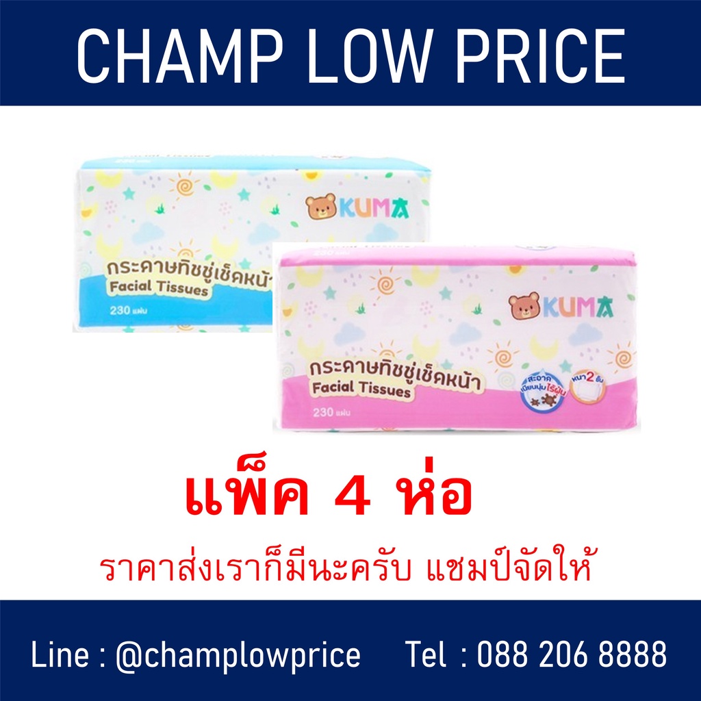 KUMA กระดาษเช็ดหน้า 230 แผ่น กระดาษทิชชู่ คุมะ แพ็ค 4 ห่อ