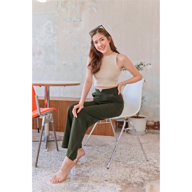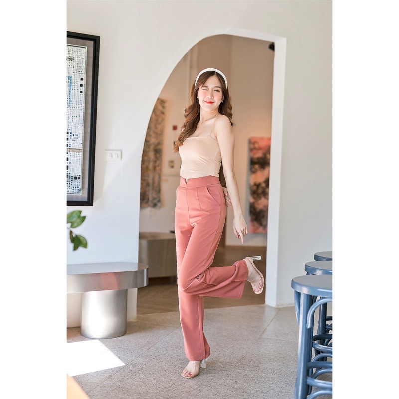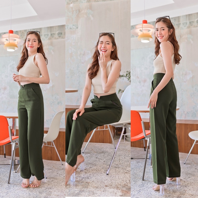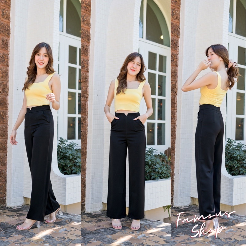 🍒ขอบเอวV🍒กางเกงเอวขอบVผ้าฮานาโกะ-ซิปหลัง-ขากระบอกใหญ่🏷️งานป้ายFAMOUS📦พร้อมส่ง