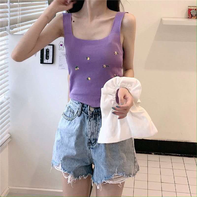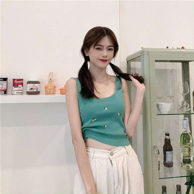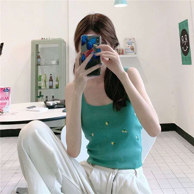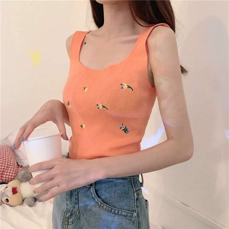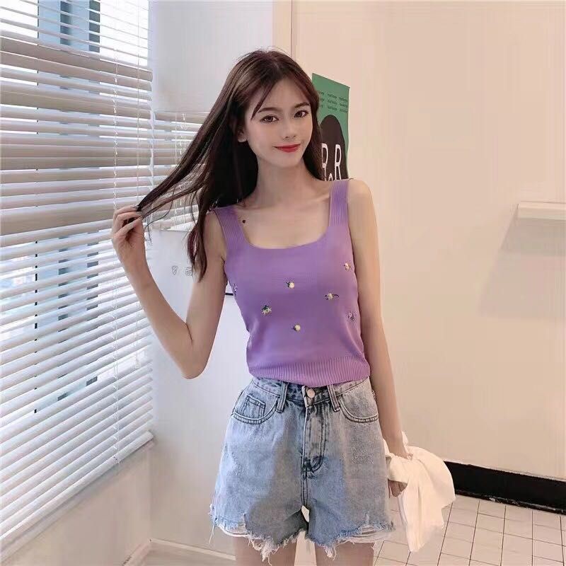เสื้อกล้ามไหมพรมลายดอก (พร้อมส่ง/ใหม่#32008) คอเหลี่ยมทรงรัดรูปสไตล์เกาหลี แขนกุดสำหรับ