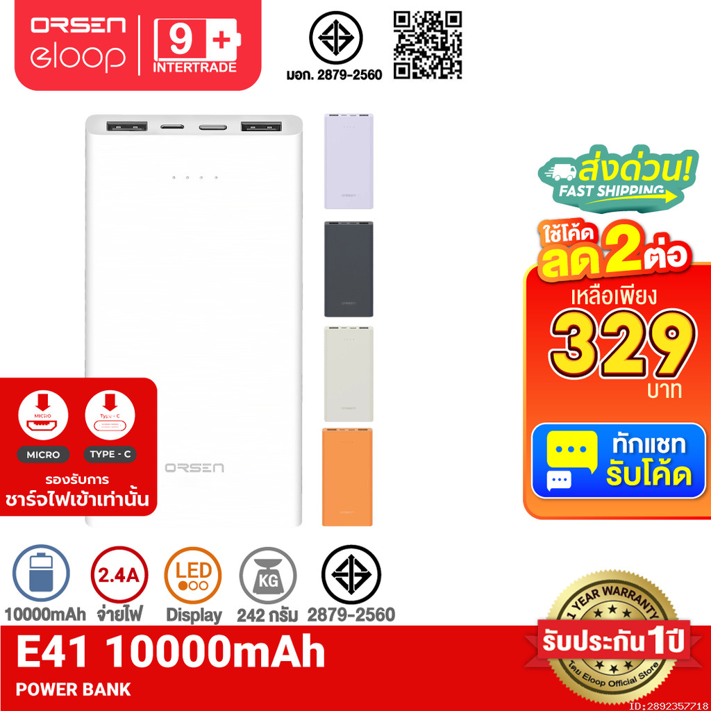 [329บ.โค้ดคุ้ม] Orsen by Eloop E41 แบตสำรอง 10000mAh ชาร์จ 2.4A 12W Powerbank USB Charger พาวเวอร์แบงค์