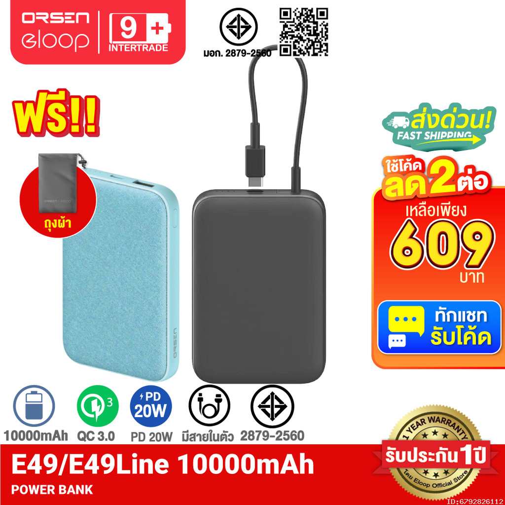 [609บ.โค้ดคุ้ม] Orsen by Eloop E49 แบตสำรอง 10000mAh มีสายในตัว และ ไม่มีสาย PD 20W PowerBank ชาร์จเร็ว