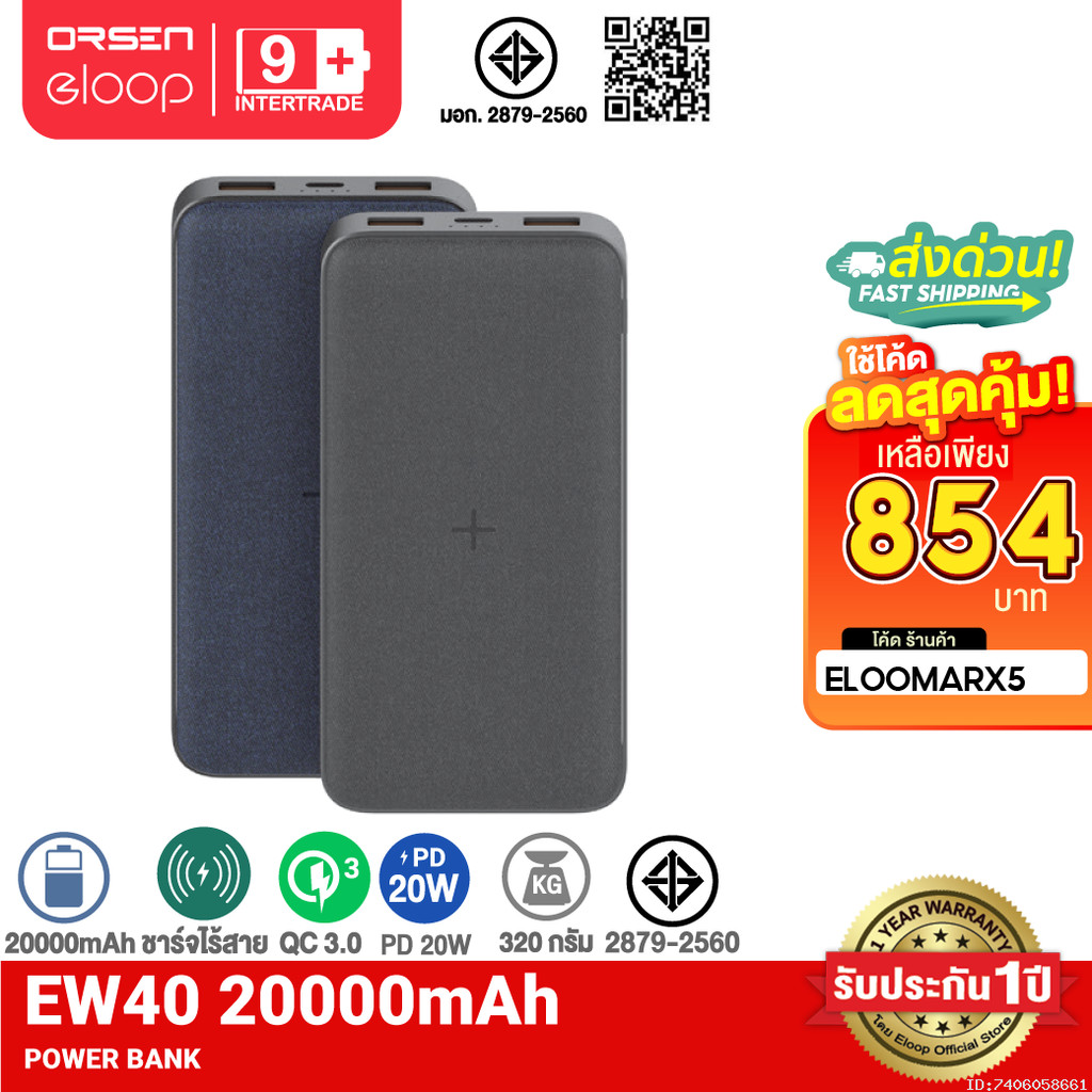 [854บ.โค้ดคุ้ม] Orsen by Eloop EW40 แบตสำรองไร้สาย 20000mAh Wireless Charge 15W Powerbank พาวเวอร์แบงค์