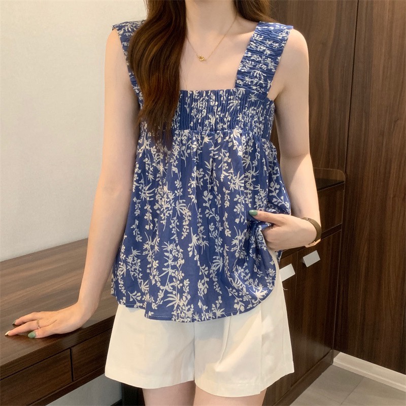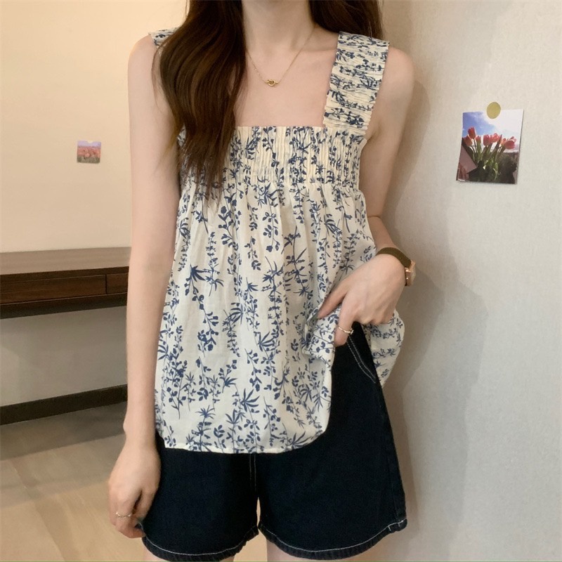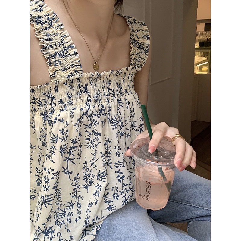 เสื้อสายเดี่ยว สายสม็อค ลายดอกไม้ สไตล์เกาหลี น่ารักๆ ใส่สบาย ทรงหลวม รหัส 324