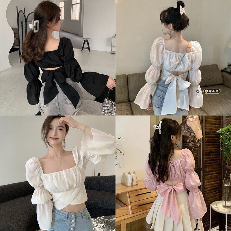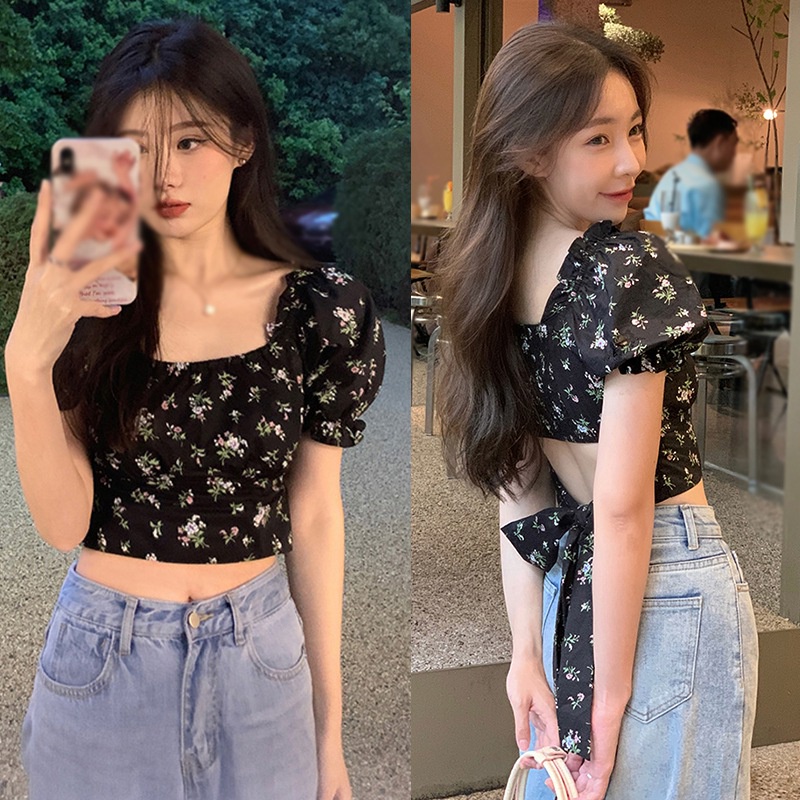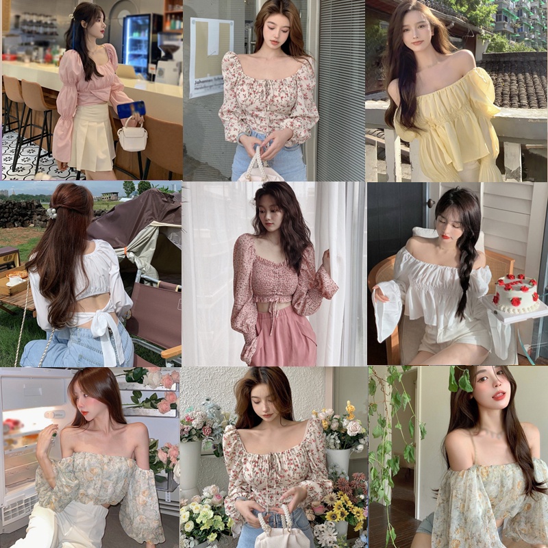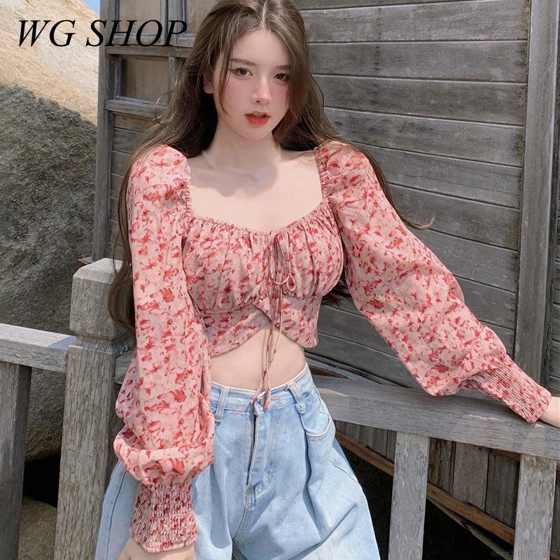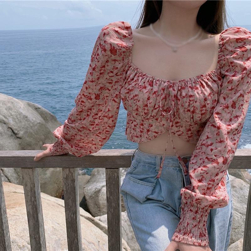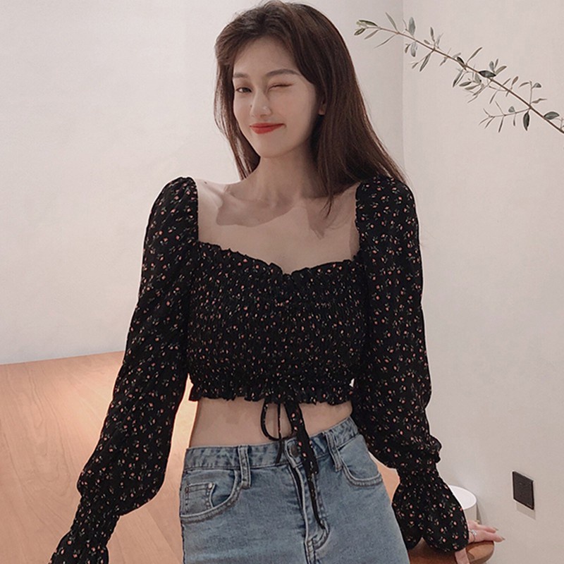 เสื้อครอป แขนยาว ชีฟอง คอสี่เหลี่ยม พิมพ์ลายดอกไม้ แฟชั่น สําหรับผู้หญิง