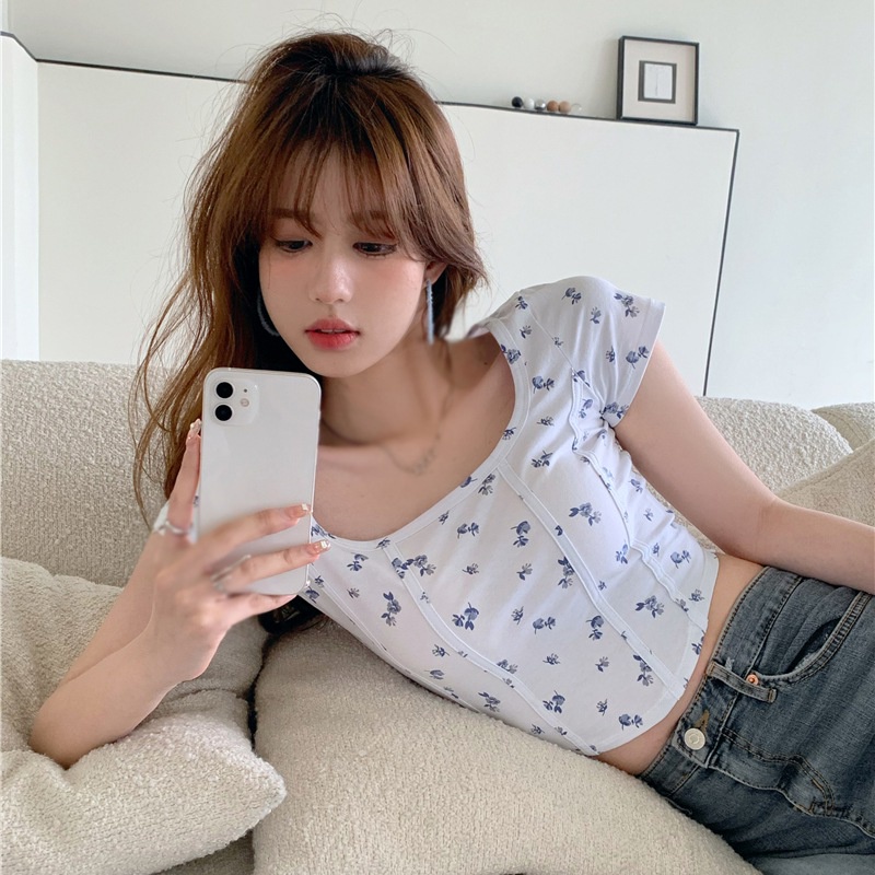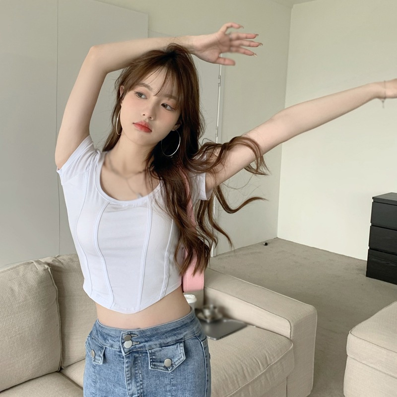 เสื้อครอป เสื้อยืดแขนสั้น คอสี่เหลี่ยม เข้ารูป เซ็กซี่ สไตล์เกาหลี สําหรับผู้หญิง