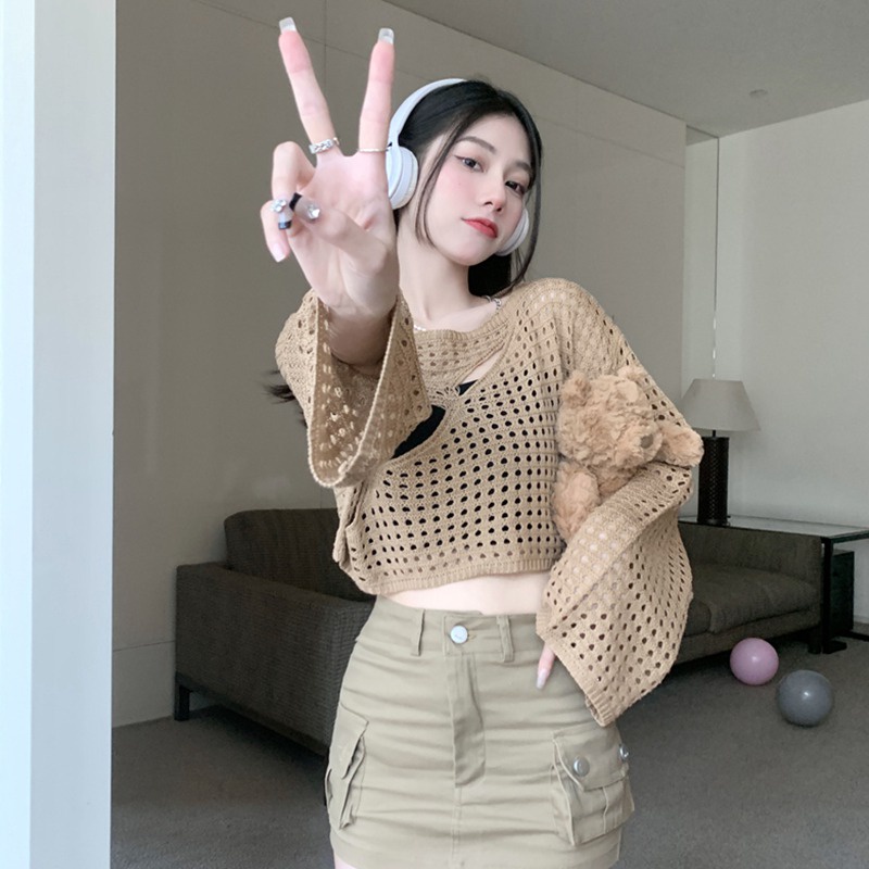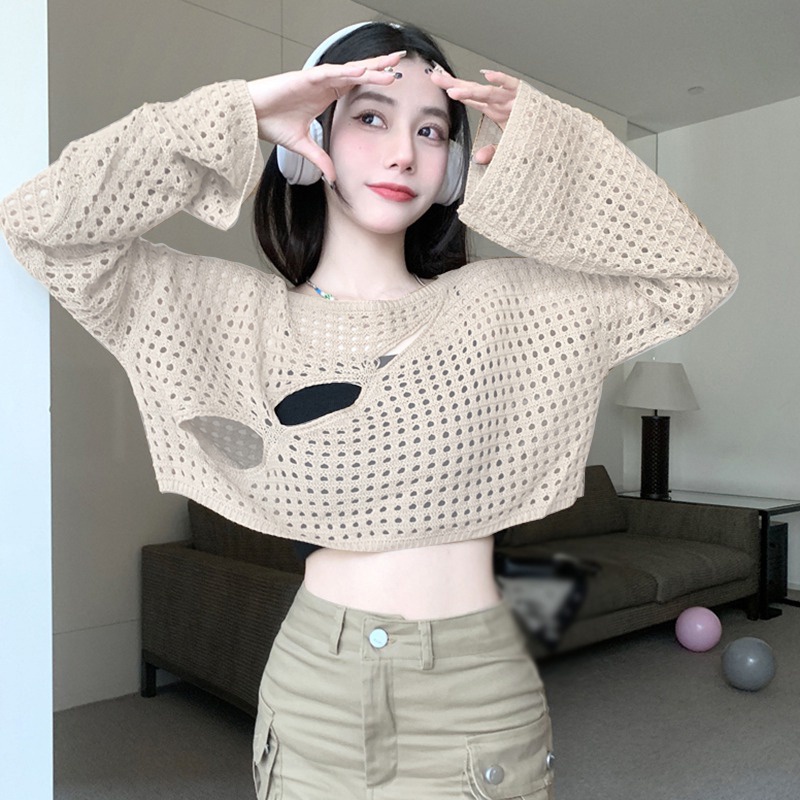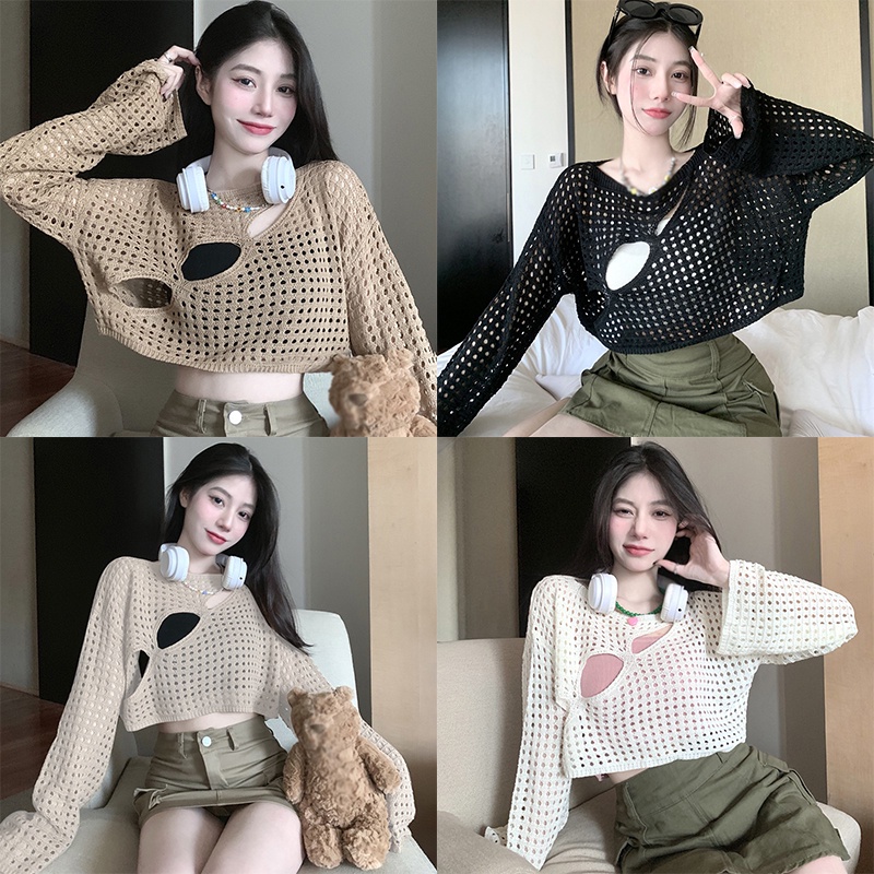 เสื้อครอปท็อป ผ้าถัก ซีทรู ผ้าตาข่าย ทรงหลวม เซ็กซี่ สําหรับผู้หญิง