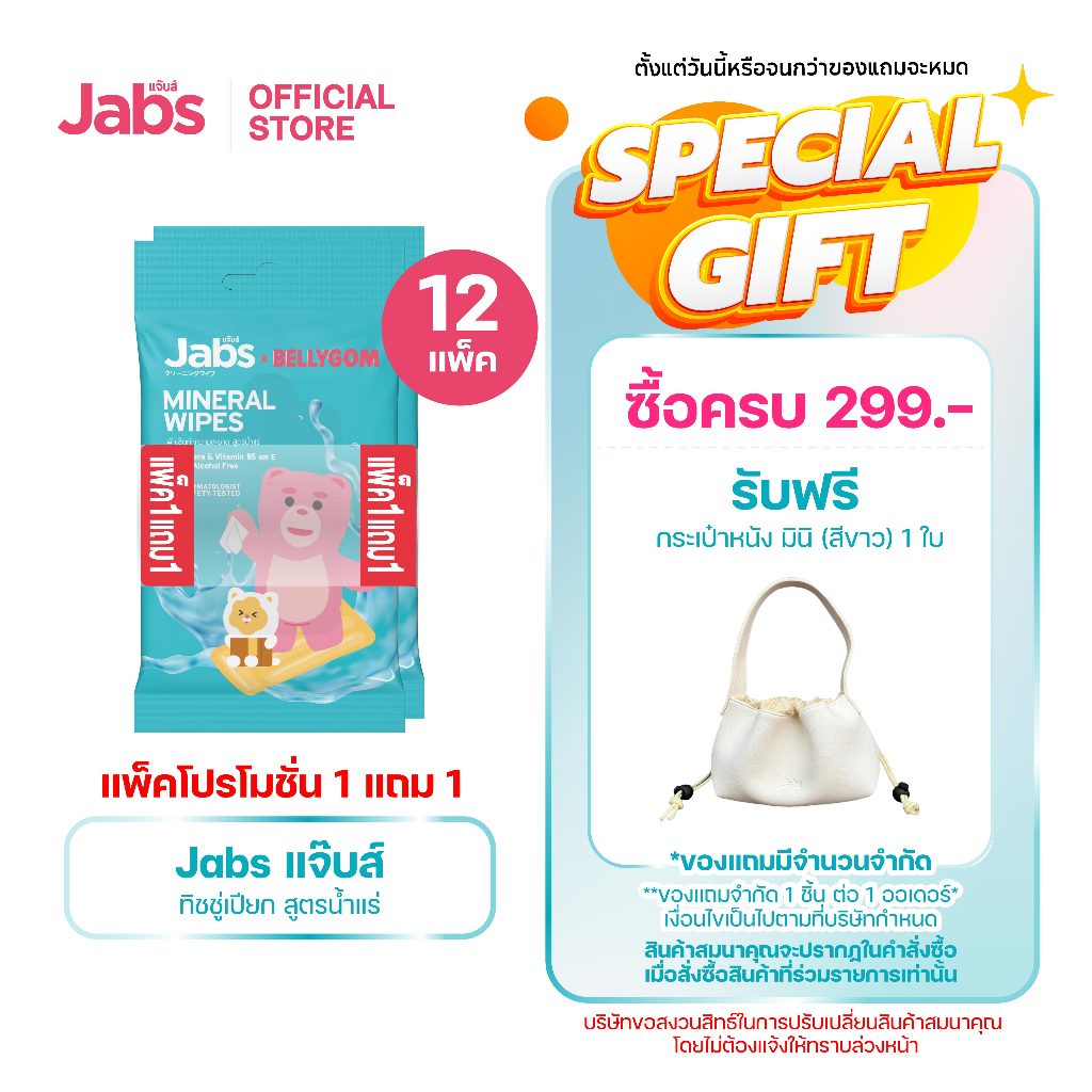 Jabs x BELLYGOM Mineral Wipes ทิชชู่เปียก สูตรน้ำแร่ธรรมชาติ 10 แผ่ น (แพ็คโปรโมชั่น 1 แถม 1) x12