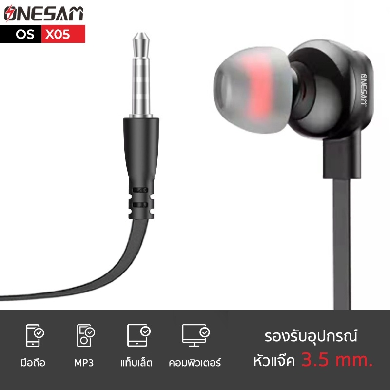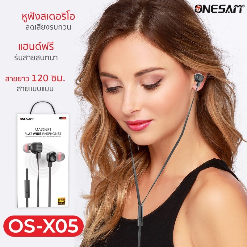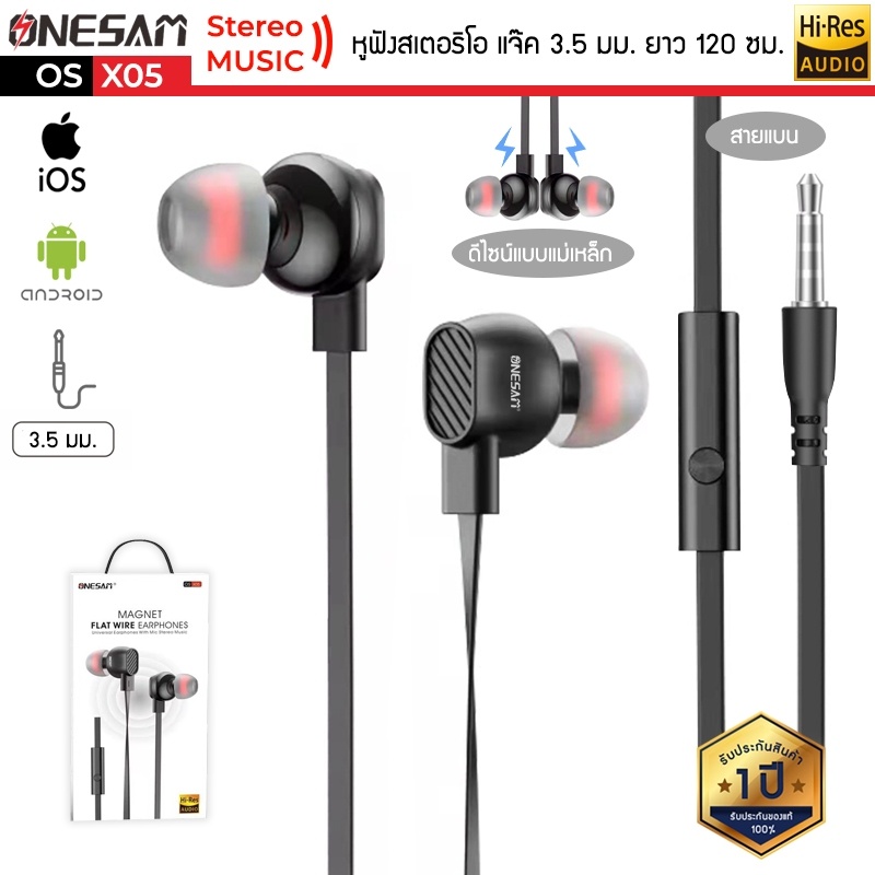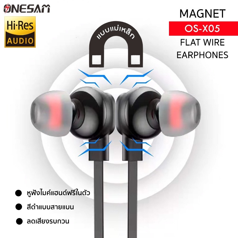 หูฟังแบบแม่เหล็ก ONESAM รุ่น OS-X05 สายแบน แจ๊ค 3.5 มม. Magnet Flat Wire Earphone ยาว 120 ซม. ของแท้ 100% ประกัน 1 ปี
