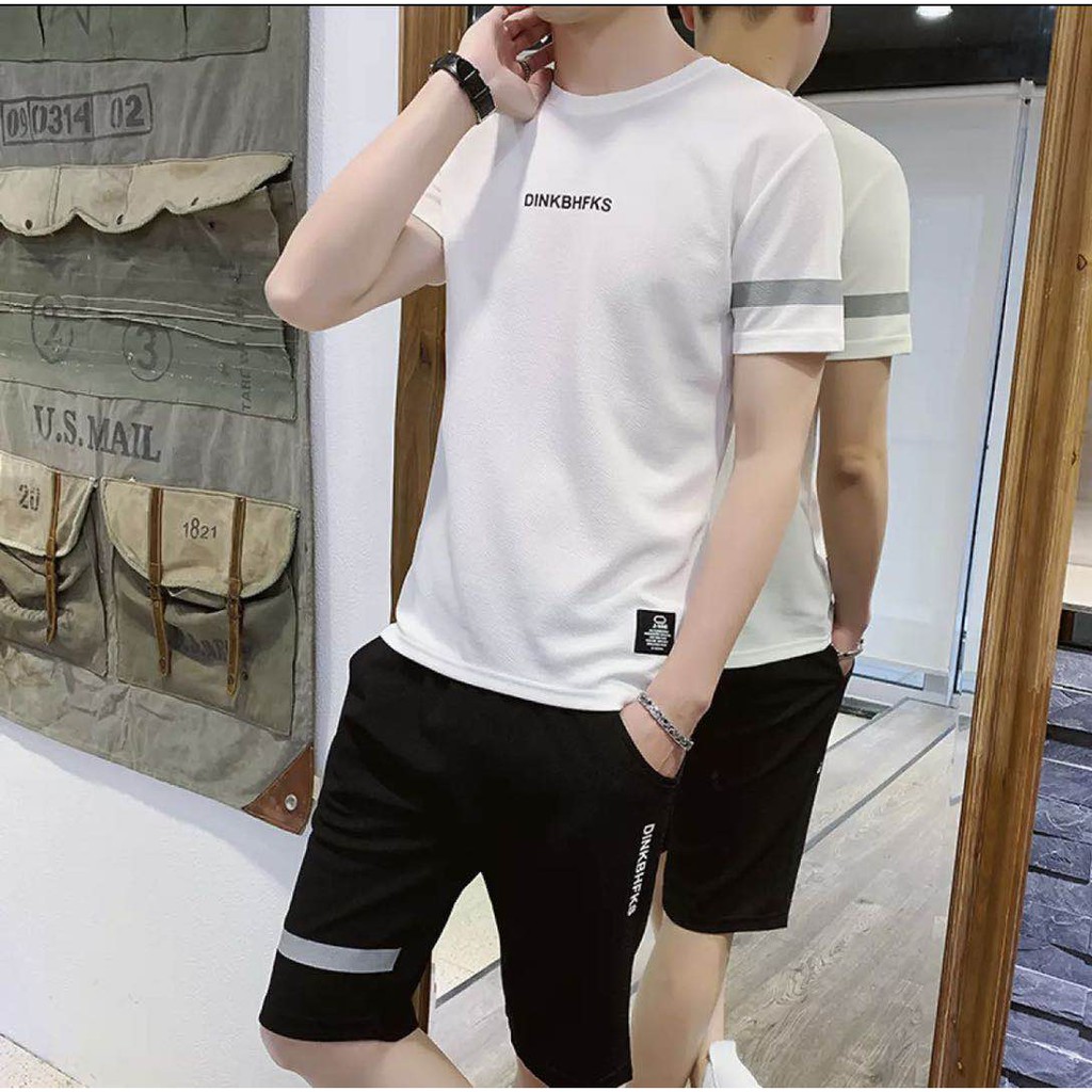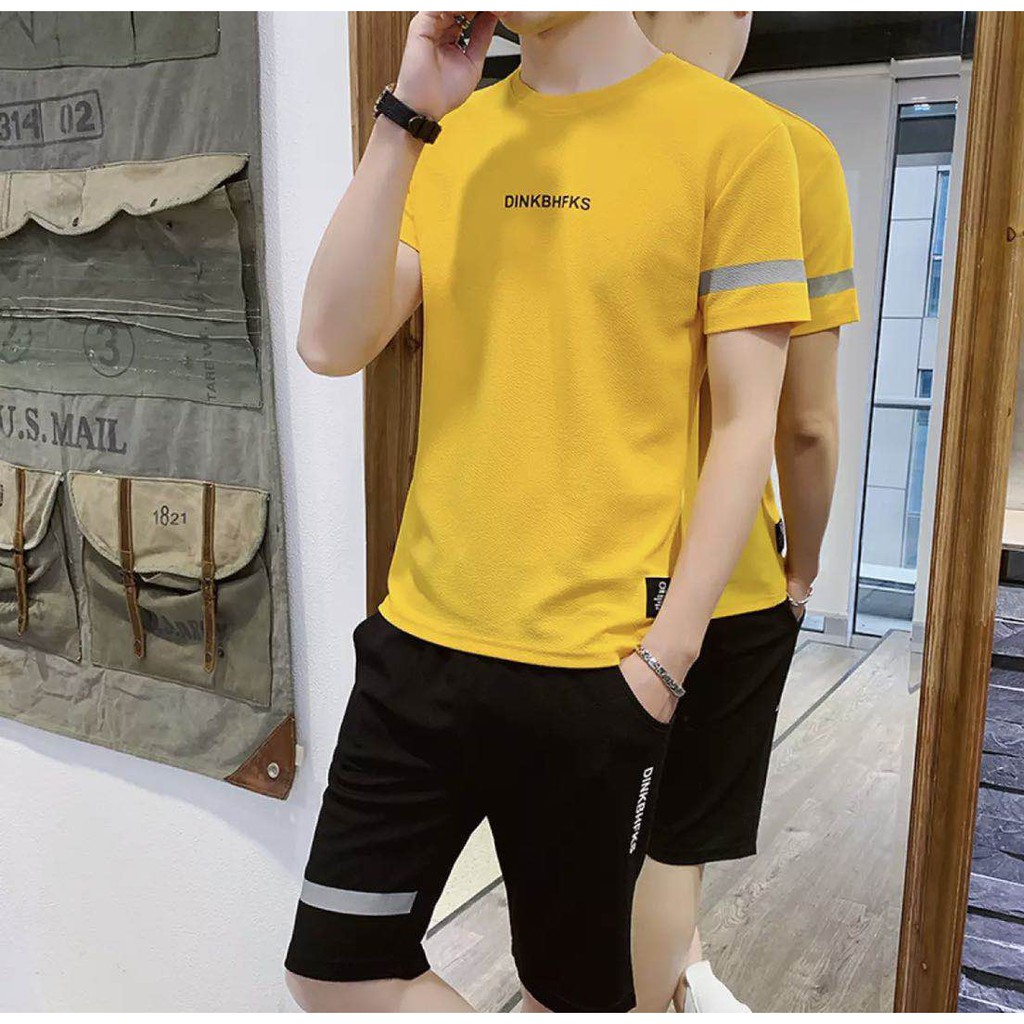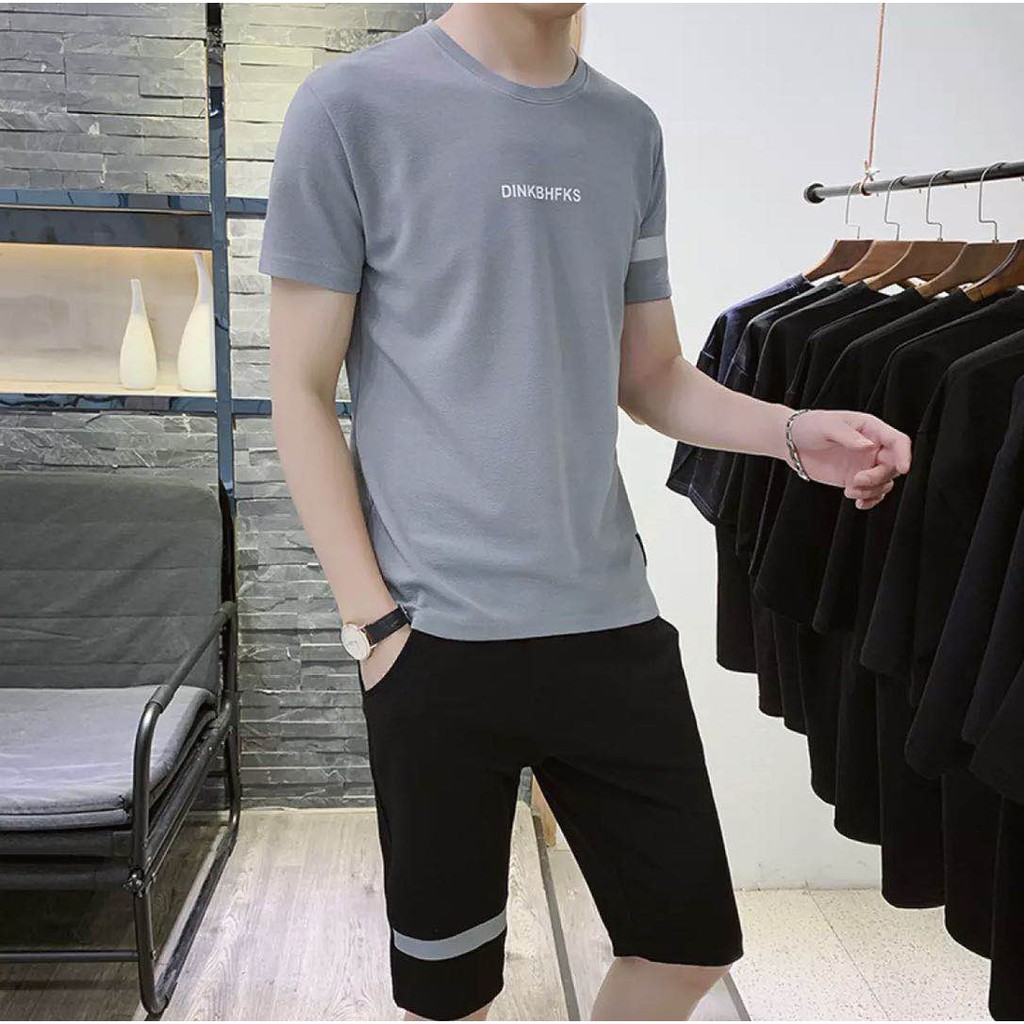 เสื้อ+กางเกงขาสั้น ผ้าเบา ไม่หด ไม่ย้วย เสื้อยืดคอกลมสีพื้น ชุดกีฬาผู้ชาย ชุด
