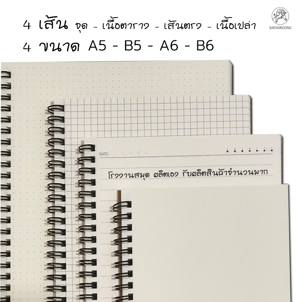 Saengroong สมุดสันห่วง ปกน้ำตาล เนื้อถนอมสายตา ขนาด (A5/A6/B5/B6) 50แผ่น/1เล่ม