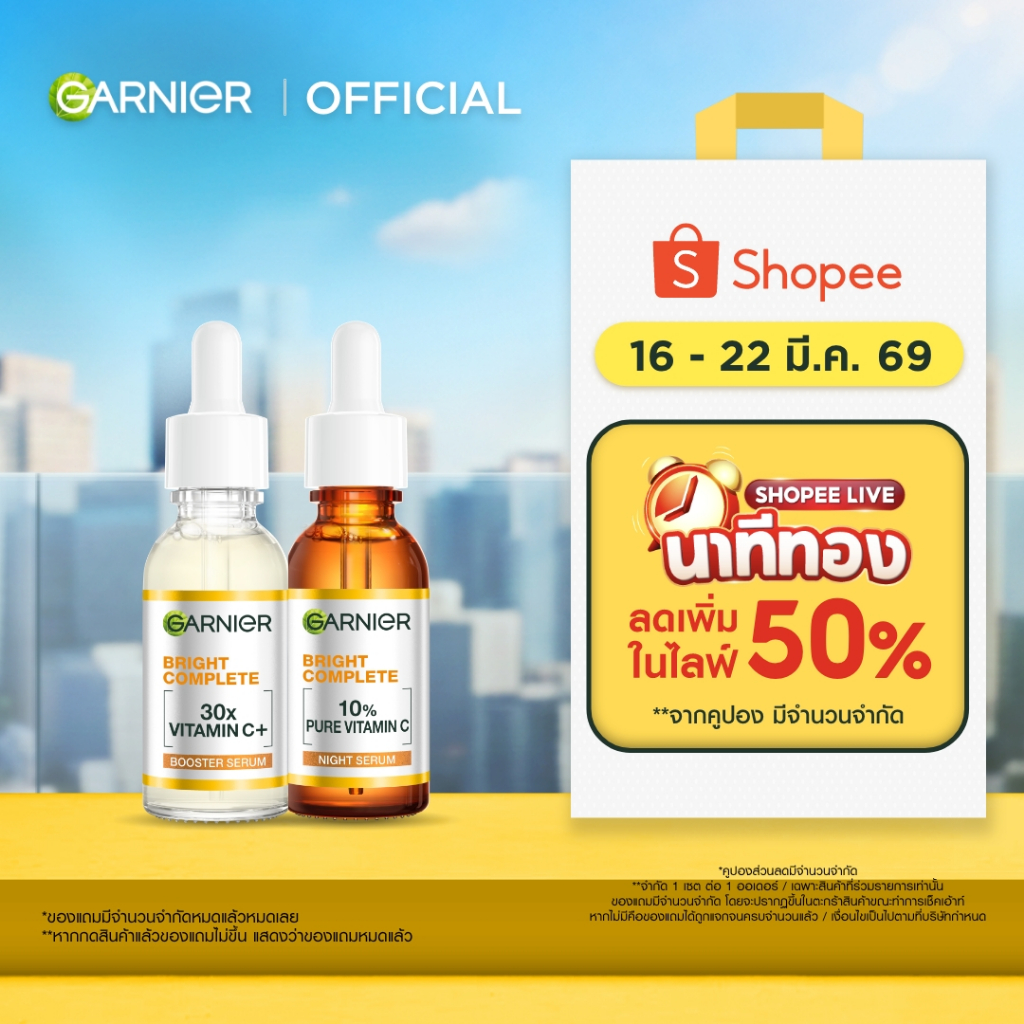 [สยบจุดดำ X2] การ์นิเย่ ไบรท์ คอมพลีท โอเวอร์ไนท์ บูสเตอร์ เซรั่ม 30 มล. + วิตามินซี บูสเตอร์ เซรั่ม 30 มล. Garnier Brig